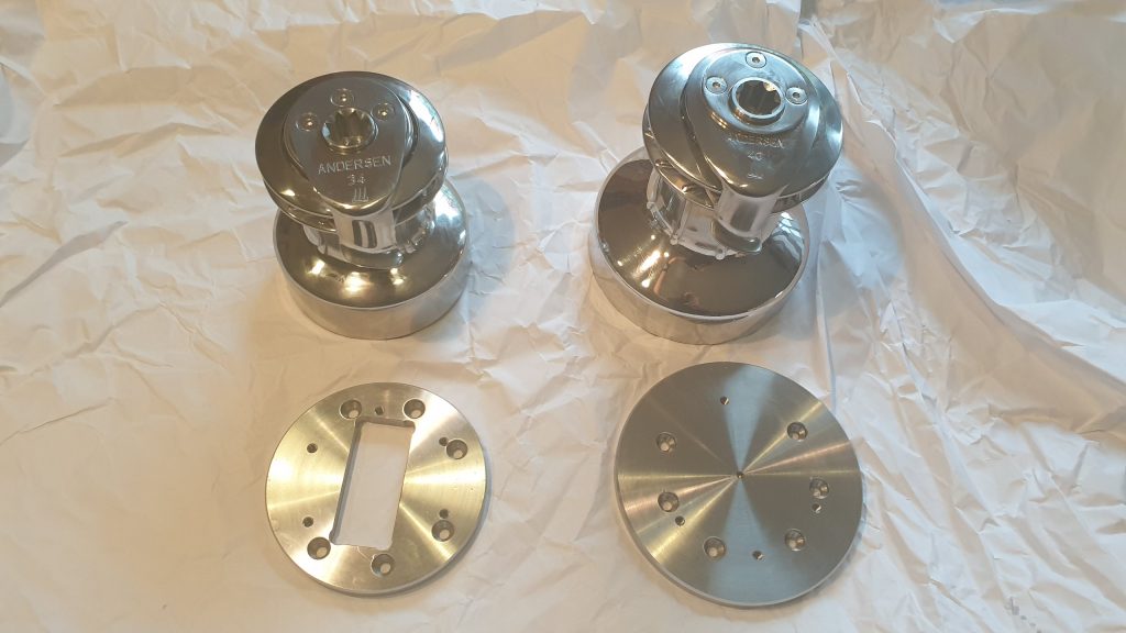 Es gibt für unser Mädchen auch zwei neue Winschen, da die Großschotwinsch und die Reff-Wisch leider schon am Ende ihrer Lebenszeit angekommen waren. Auch hier wieder: alte Löcher und neue Bohrungen passen natürlich nicht zusammen. Also hat der Skipper auch hier entsprechende Adapterplatten angefertigt.