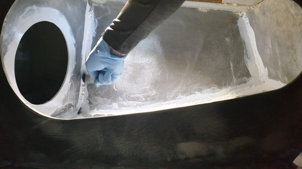 Wie wir bereits erzählt hatten, waren hier an den alten Schweißnähten Oxidationen entstanden, die Jochen ja mühevoll in Kleinarbeit mit Drahtbürste gesäubert hat. Nach langem Recherchieren und sogar Nachfragen bei den Hilfe-Redakteuren der Fachzeitschrift „PALSTEK“ konnte uns keiner sagen, wie und was in unserem Fall das richtige ist. Letztendlich erfahren wir von einem SIKA-Vertreter, daß die gesamte Fläche angeschliffen, dann sofort mit einem Reiniger abgewaschen und final grundiert werden muß. Da dies alles „just-in-Time“ erfolgen muß, damit nicht das Alu gleich wieder eine Oxidschicht bildet, konnte hier nur Tankloch für Tankloch gemacht werden. Ein Loch schleifen, absaugen, reinigen, grundieren, trocknen lassen – nächstes Loch.