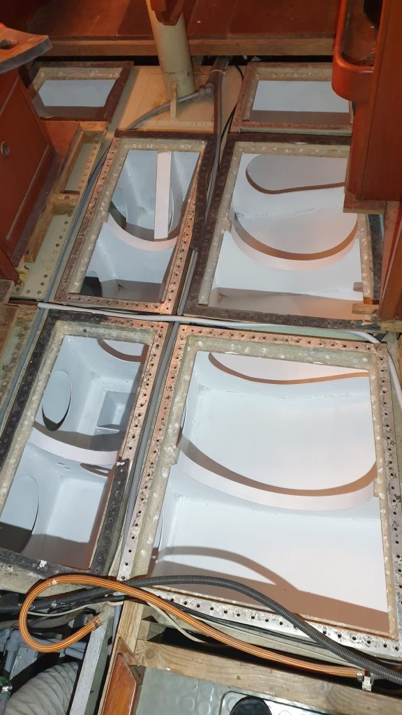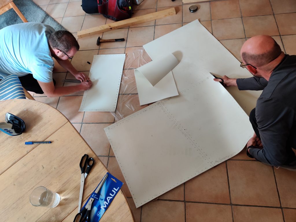 Auch die Dichtung zwischen Deckel und Tank mussten natürlich erneuert werden. Hierzu wurde aus Gummimatten je nach Deckelgröße mühsam mit der Schere ein Rahmen ausgeschnitten und die Schraubenlöcher mit einem Locheisen ausgestanzt. Hier hat uns Johannes unterstützt, der uns wieder einmal besucht hat, um zu sehen, wie weit unser Schiffchen ist und auch mal mit Hand anlegen wollte. Die Werkstatt hierzu war wieder mal unser Wohnzimmer.