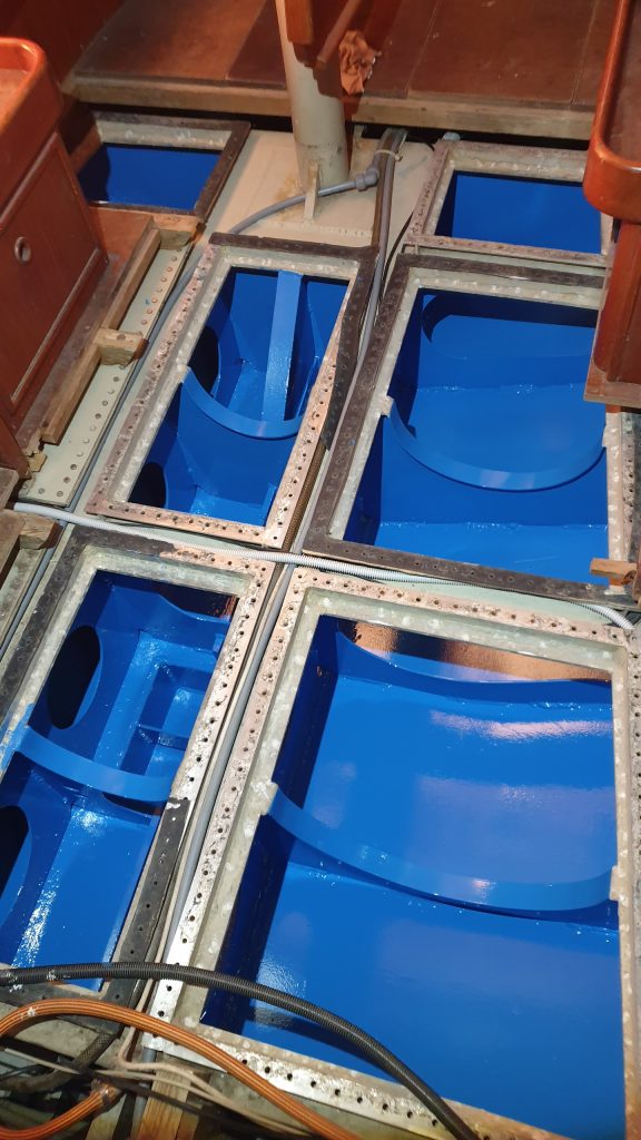 Nach der Grundierung konnte dann der Endlack aufgetragen werden, natürlich nachdem die Grundierung wieder erst komplett angeschliffen ist. Hier konnten wir uns sogar für eine Farbe entscheiden. Jochen hat sich hier für ein Blau entschieden (Blau macht glücklich), da sieht man auch wenn Dreck reinkommt. Hoffen wir mal das jetzt alles gut ist, die Zeit wird es zeigen.