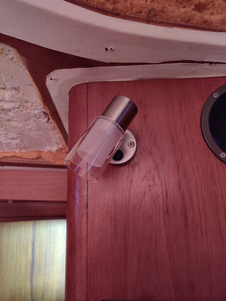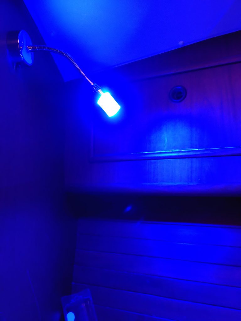 die gesamte 12V-Innenbeleuchtung wurde auf LED-Beleuchtung umgestellt. Auch hier gab es ein paar kleine Schwierigkeiten: die Lichtleisten gibt es nicht genau in der Größe der alten, ausgebauten Leuchten. Also muß auch hier wieder improvisiert werden und aus Kunststoff wurden „Unterlegscheiben“ ausgeschnitten, damit die alten Deckenausschnitte auch wieder abgedeckt sind. Wir haben bei einigen Leuchten auch umschaltbare Farben eingebaut, so daß wir von weiß- auf rot- und sogar blaues Licht umschalten können. Rotes/ blaues Licht ist angenehm, wenn man bei Nacht im Dunkeln Licht benötigt. Da ist rotes/ blaues Licht viel angenehmer für das Auge, da sich dieses nicht von Stockdunkel auf total hell umstellen muß.