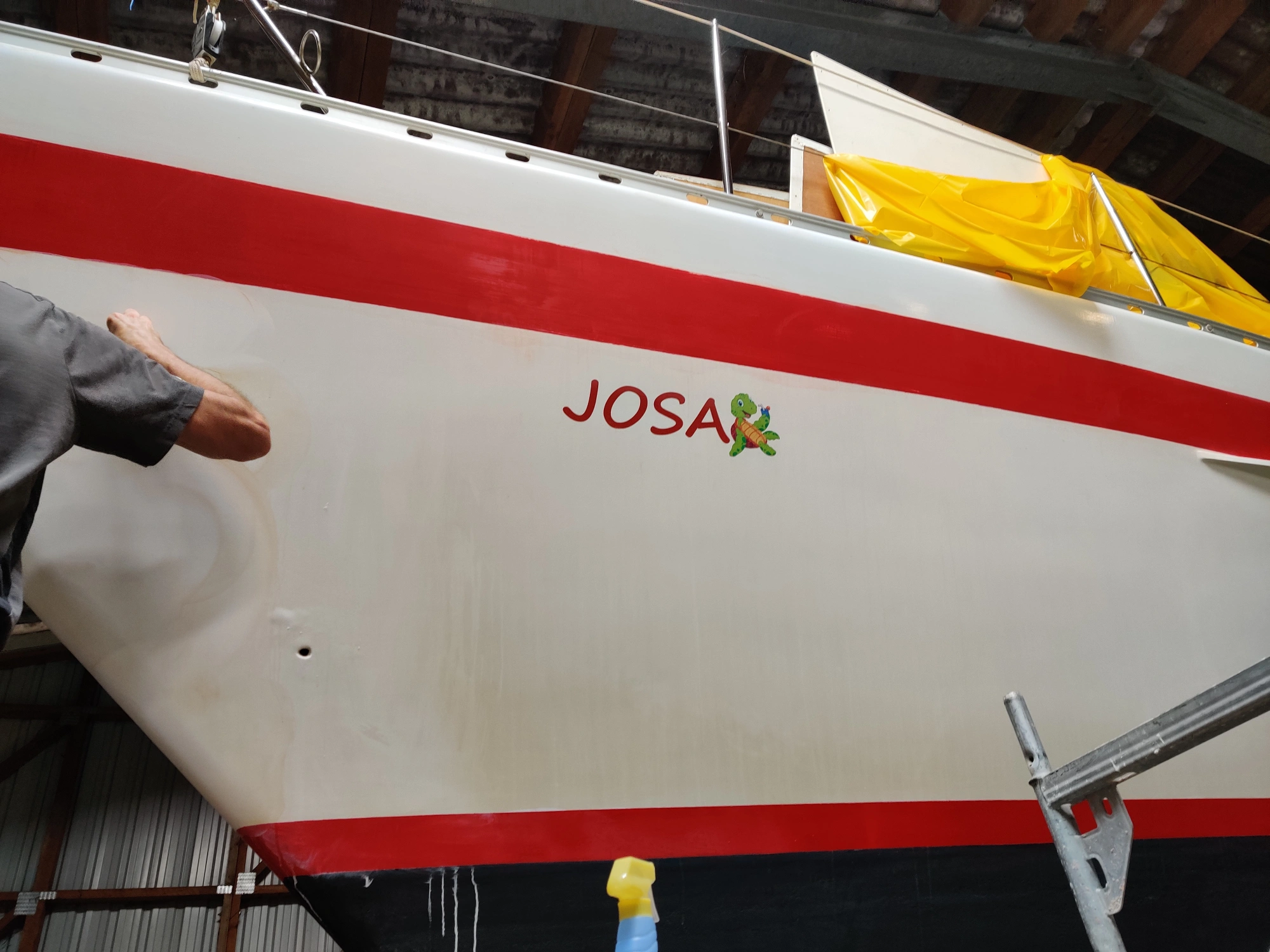 Der Antifoulinganstrich (schwarze – unter der Wasserlinie) wurde von mir ja bereits gereinigt. Der rote „Ralleystreifen oberhalb unseres Wasserpasses erhielt von mir einen neuen Anstrich. Ich bin damit sehr zufrieden, der Profihandwerker unter uns findet es nicht ganz so toll. Meine Meinung – ein 40 Jahre altes Boot muß nicht aussehen, wie frisch vom Band lackiert und man darf ruhig sehen, daß das selbst gemacht ist.