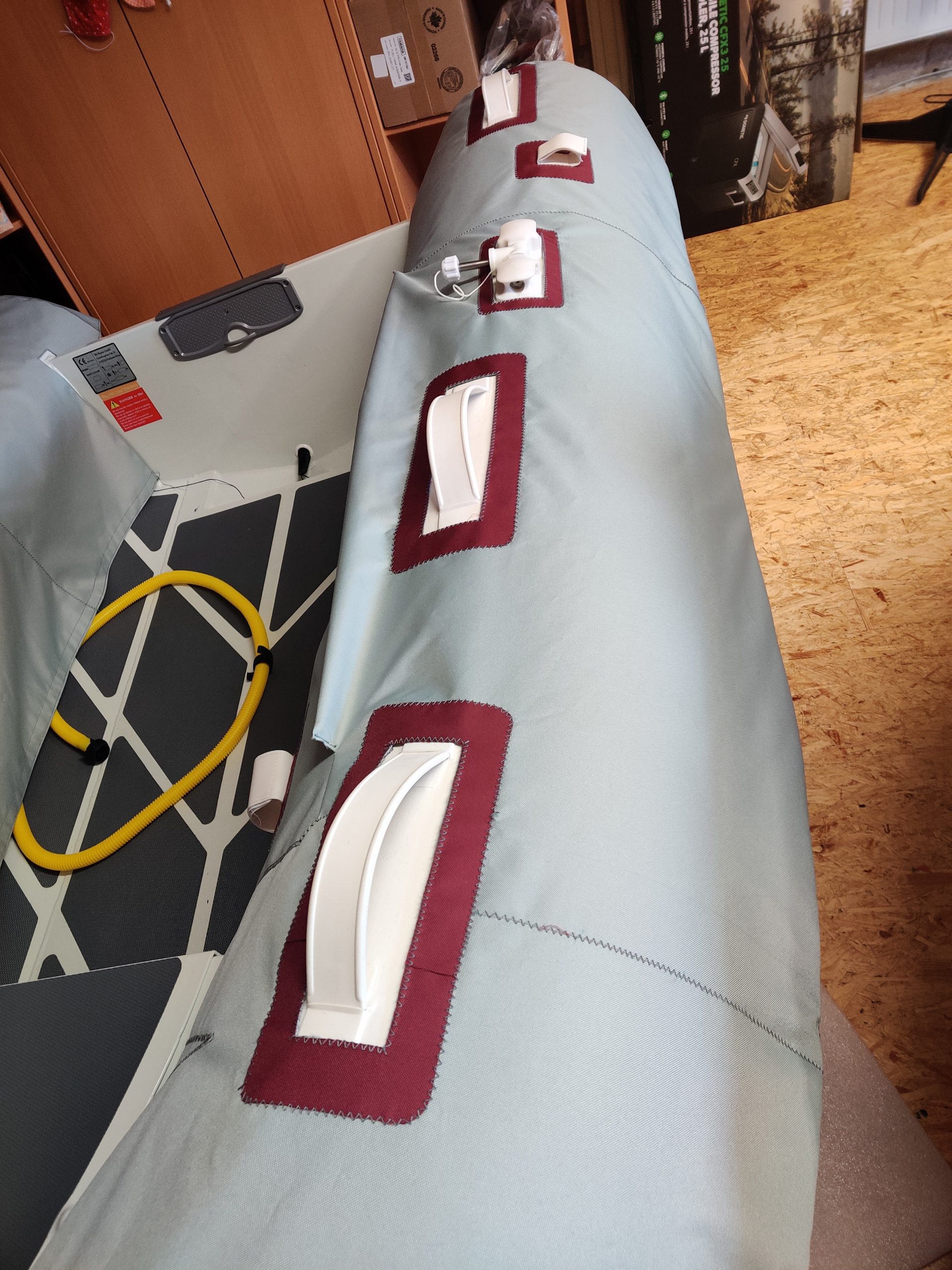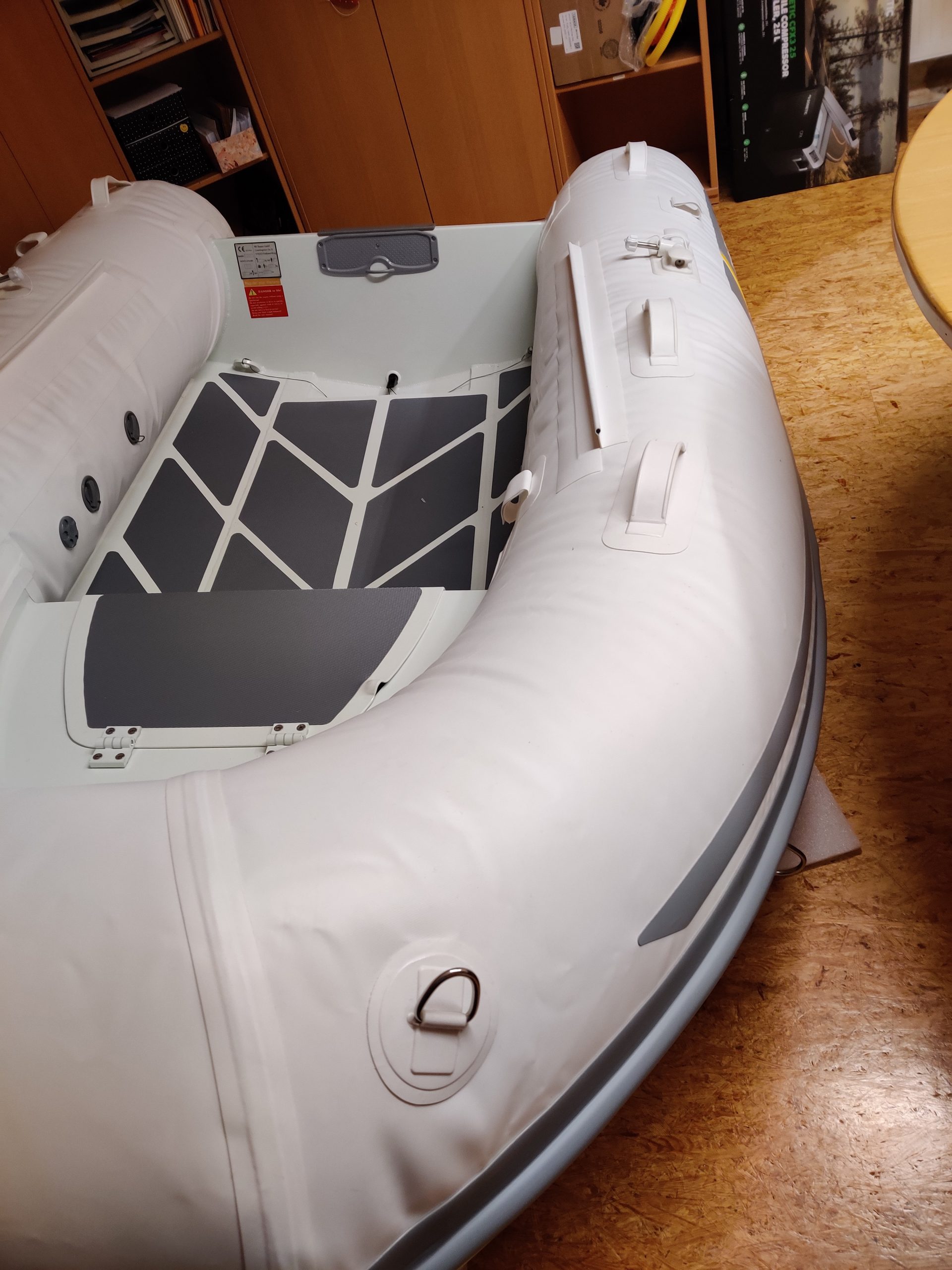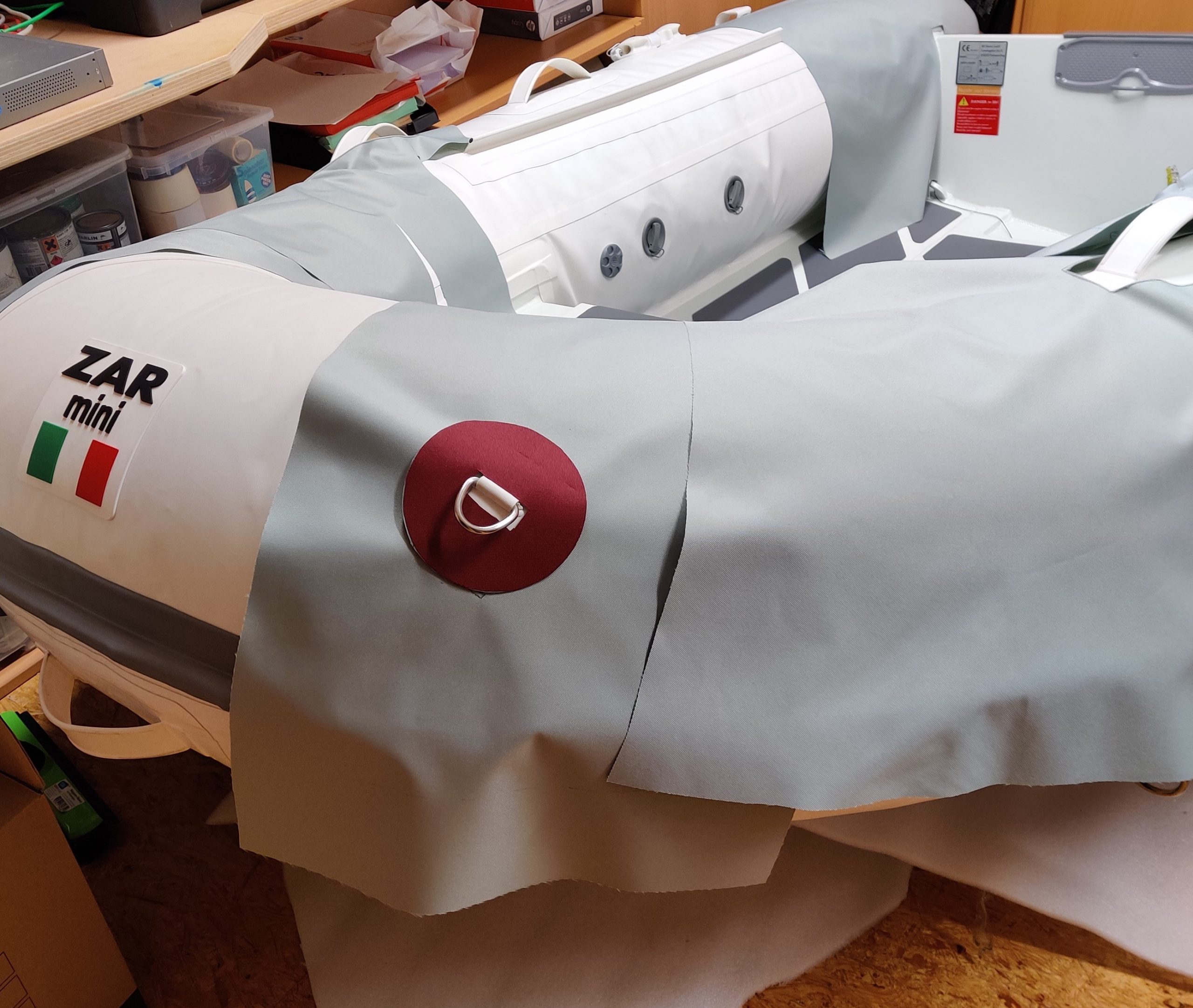 der neue Anker hängt jetzt auch endlich an seinem Platz. Unser Dinghi (das Beiboot, das uns beim Ankern trockenen Fußes an Land bringt) wurde samt neuem Motor geliefert. Für das Dinghi hab ich dann einen „Schlafanzug“ genäht, der als UV-Schutz dient und das PVC vor vergilben und zerbröseln schützen soll.