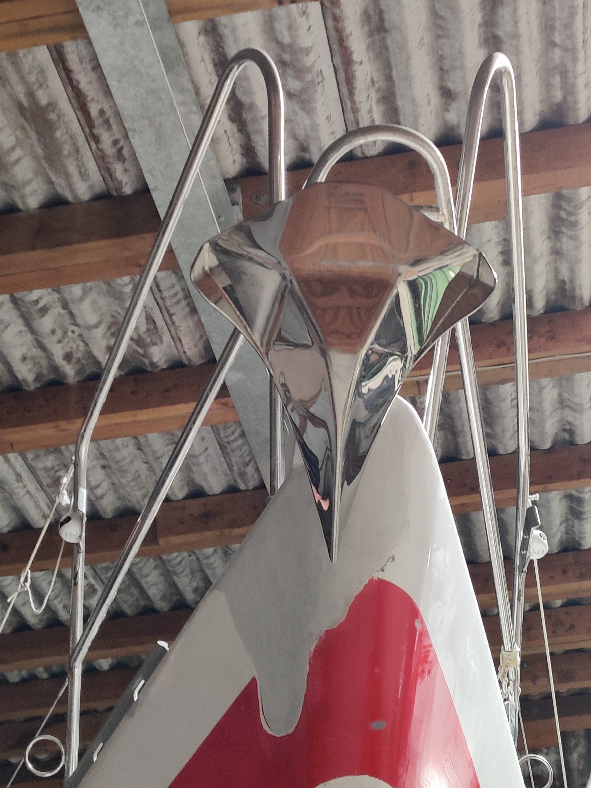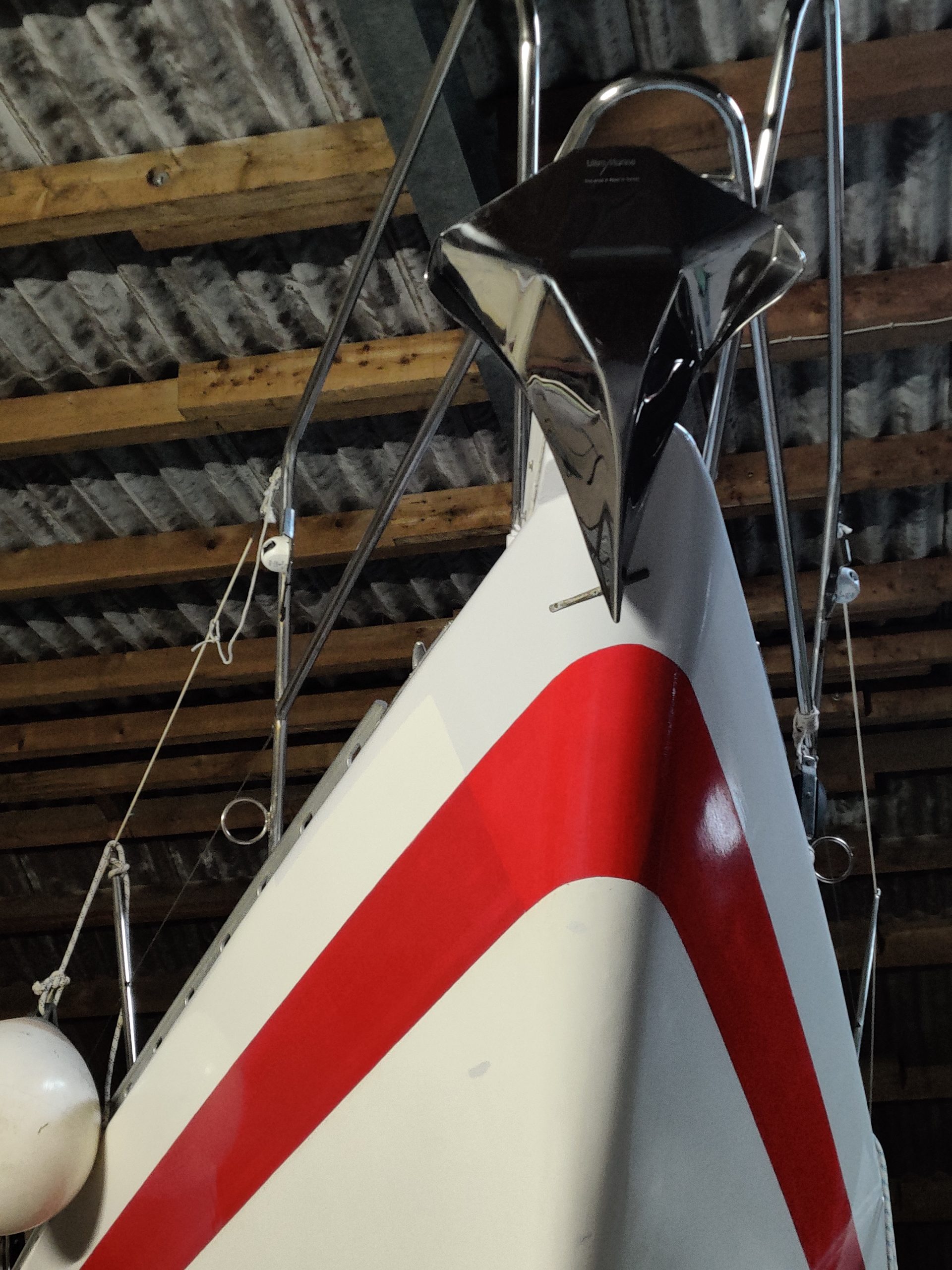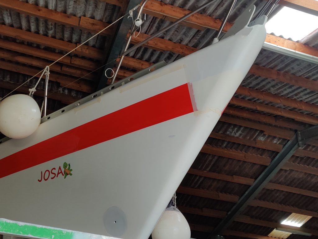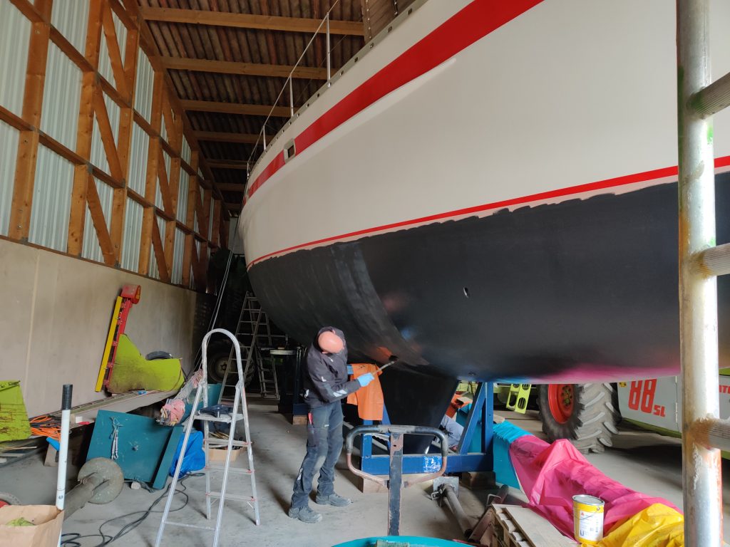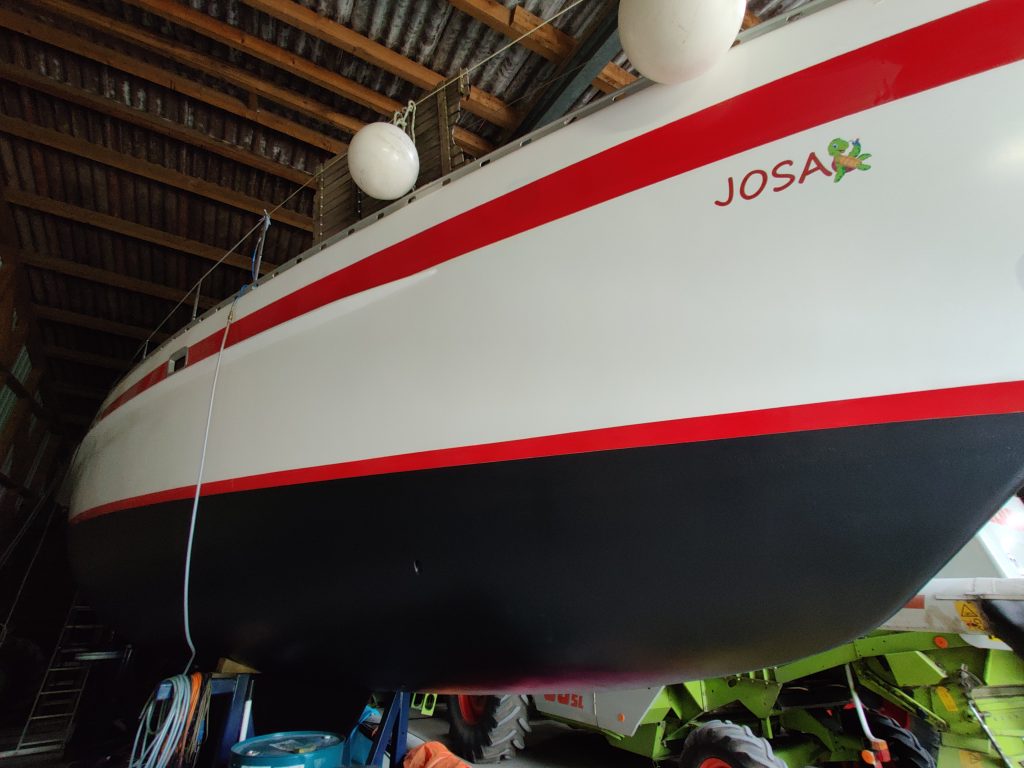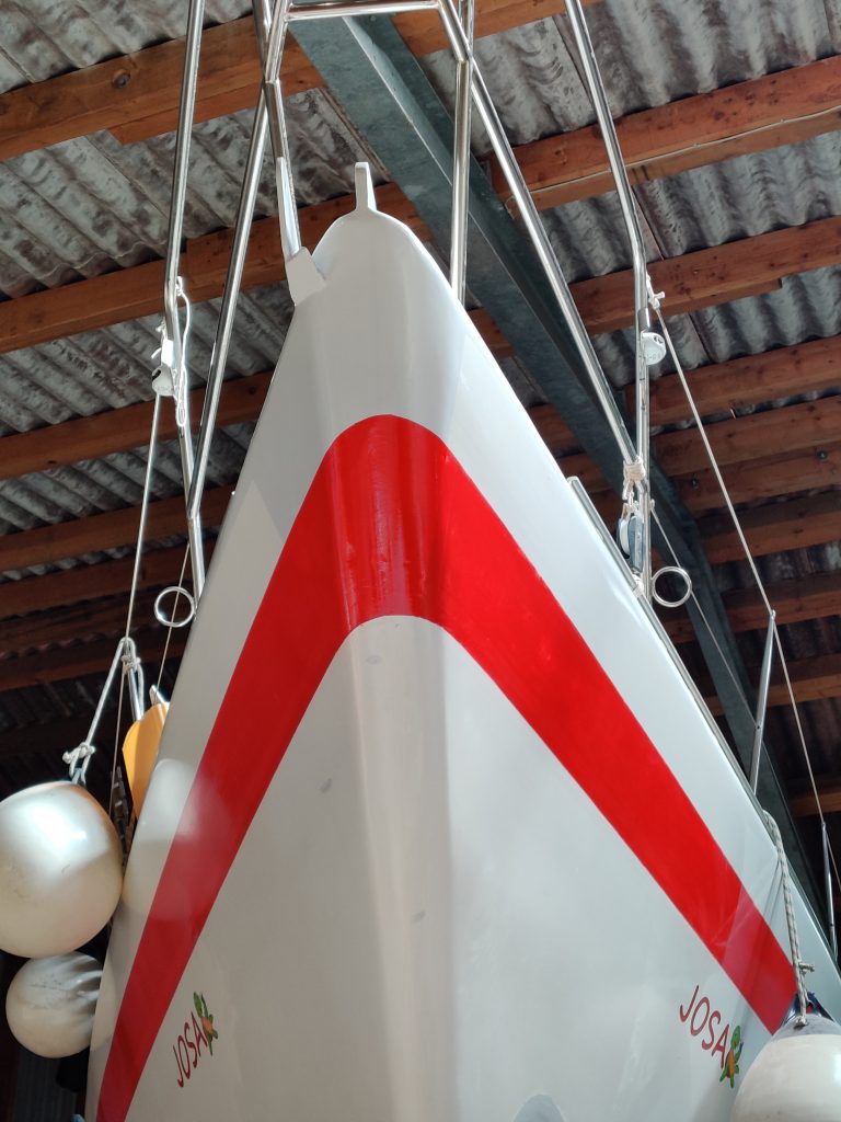 Der Skipper hat zwischenzeitlich die letzte rote Farbschicht an der Bugspitze angebracht, damit sind die Ausbesserungen am Rumpf erledigt. Auch das Antifouling wurde inzwischen neu aufgebracht. Hier hat uns wieder einmal Johannes besucht und einen Tag mit unterstützt und ist dafür aus München angereist. Und siehe da, zwei Mann, zwei Farbrollen – ein Tag zwei Anstriche – fertig!!!