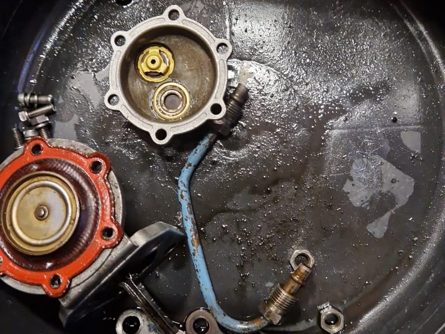- Dieselförderpumpe: das ist eine kleine Membranpumpe, die die eigentliche Einspritzpumpe mit Diesel versorgt. Wenn hier die Membran defekt ist, läuft die Brühe auch direkt in den Motorblock. An die Pumpe kommt man relativ leicht ran, also ausbauen zerlegen und mal schauen. Gesehen habe ich dann leider nichts Offensichtliches. Aber vom Job her kannte ich das auch schon, vielleicht irgendwo ein Haarriss der nicht erkannt wird. Da die Pumpe noch relativ günstig ist, wird hier Ersatz gesucht und auch gefunden, in Antwerpen. Sollte dann mit Paketdienst kommen, auf Nachfrage am nächsten Tag (Dienstag), haben sie es nicht geschafft dieses raus zu schicken, wegen Personalmangel, mmmh. So würde das Teil erst am Donnerstag im Laufe des Tages kommen. So haben wir noch schnell einen Leihwagen für Mittwoch organisiert und das Teil selbst abgeholt. Am späten Nachmittag eingebaut und Testlauf gestartet. Zuvor hatten wir am Dienstag, wo wir ja Zeit hatten, schonmal das alte Öl abgesaugt (immerhin 8 Liter, statt der 4 Liter die eigentlich drin sind) und neues Öl eingefüllt, mit Filtertausch. Die Ernüchterung nach einer Stunde Motorlauf, der Ölstand ist schon wieder gestiegen. Grrrrrrrr. Bleibt nur noch …