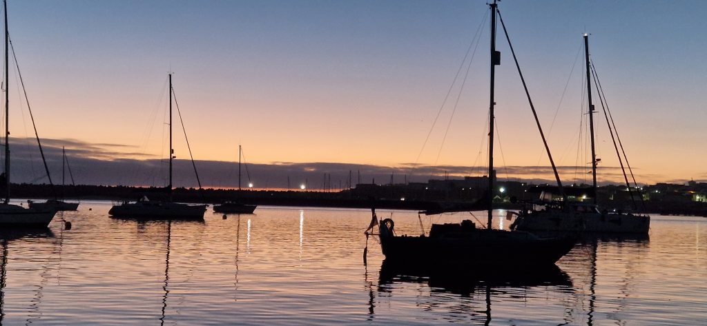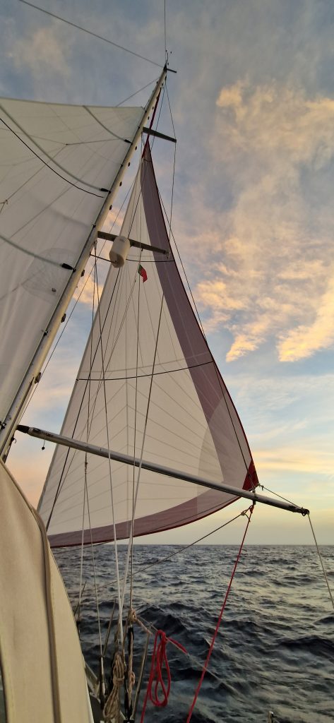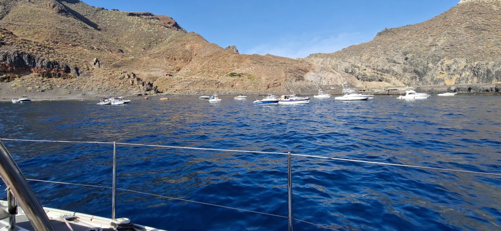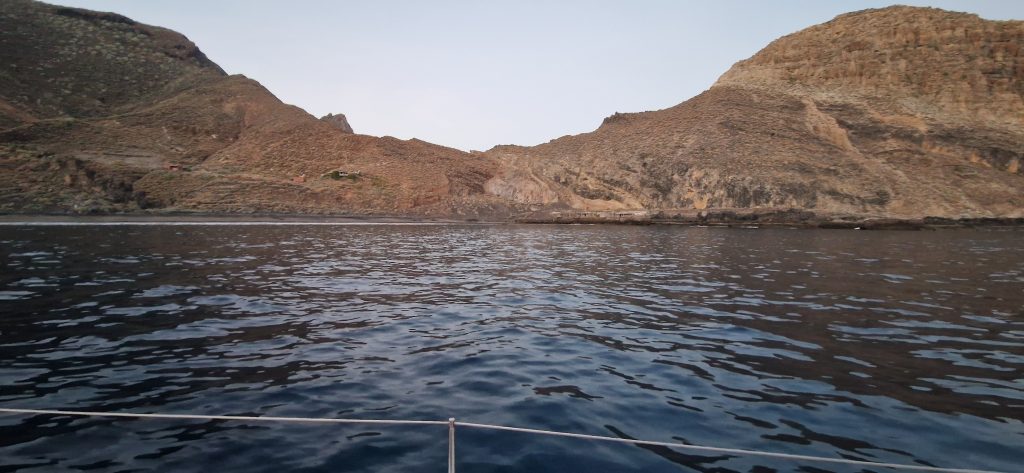 Aber die Kanaren wären nicht die Kanaren, wenn hier eine Windvorhersage passen würde. Wir hatten auf dieser Strecke wirklich alles abwechseln – von Wind von Hinten über absolute Flaute bis Wind von Vorne – wir sind aber wirklich nur in eine Richtung gefahren und haben keine Kreise gedreht!!! Man nimmt es wie es kommt und ändert halt dann auf so einer eigentlich recht kurzen Strecke (40 sm) ständig was an den Segeln. Rauf, runter, raus, rein, kleiner, größer, von Steuerbord nach Backbord und umgedreht.