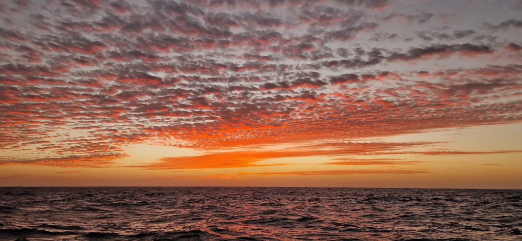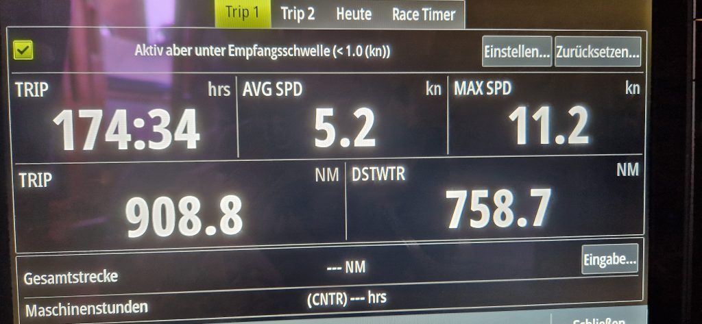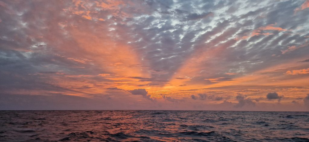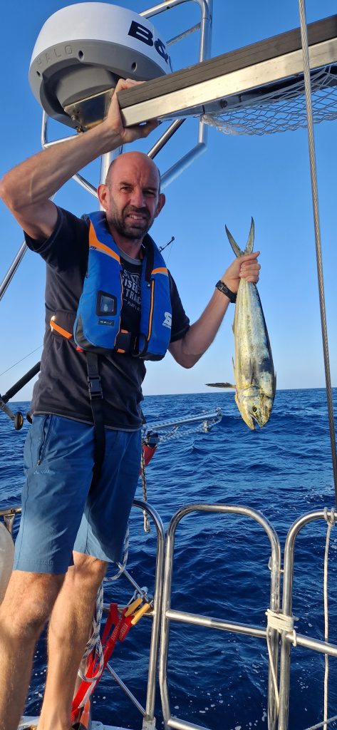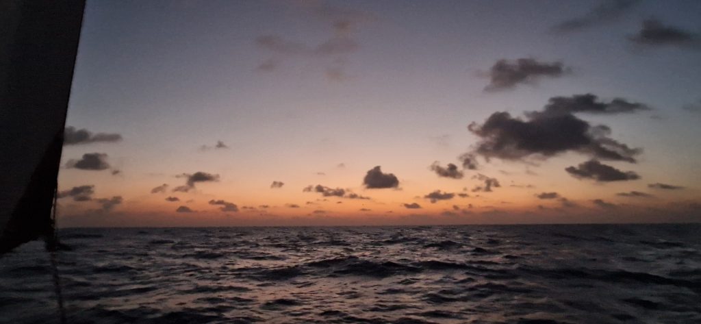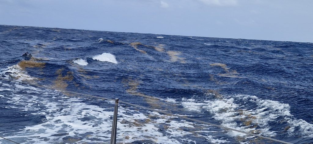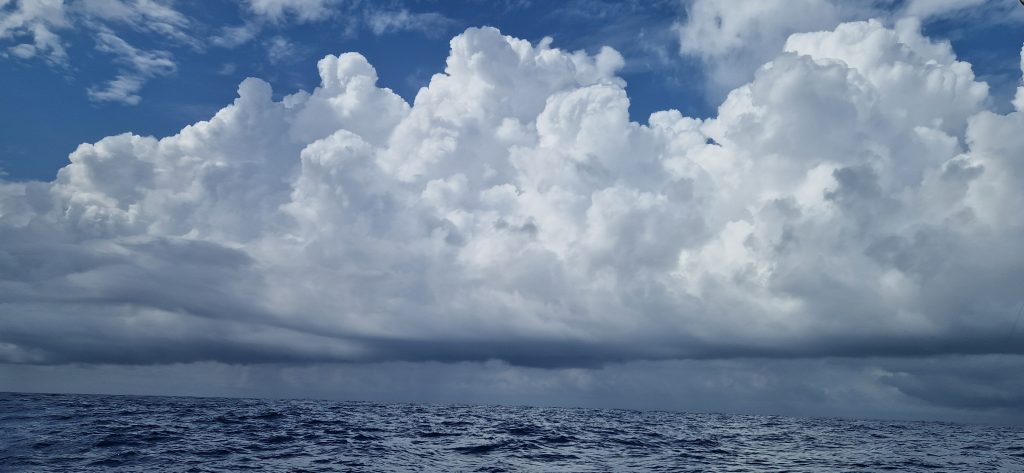 7 Sonntag: Der Tag hat eigentlich angefangen, da hatte der letzte noch nicht aufgehört. Um dreiviertel Zwölf (viertel vor Zwölf für alle nicht Bayern), war der Start zum Durchqueren einer Regenfront. Das volle Programm folgte mir Starkwind, Winddrehern und natürlich Regen. Eben mal das Schiff weiter in den Wind drehen, um sicher vor einer Patenthalse zu sein, Genua bergen und der Spaß konnte beginnen. Ich glaube das war so die erste richtige, natürliche Süßwasserspülung unseres Bootes seit Hamburg, unglaublich. Gegen 3 Uhr (wir reden hier übrigens immer von unserer Bootszeit die wir auf UTC-Time festgelegt haben, um jegliche Verwirrungen mit Zeitumstellung aus dem Weg zu gehen) war der Spuk dann vorbei. Zurück geblieben sind die Wellen und ein zu schwacher Wind, der die Segel bei dem Geschaukel richtig füllt. Das schlagen der Segel gibt wieder mal den Takt an. Ich mach mich dann mal in die Koje und Sabine übernimmt die Wache. Diese war dann irgendwann so angenervt, daß sie die Genua wieder geborgen hat, bei stärker aufkommenden Wind wieder raus geholt, geborgen bei wenig Wind, und ….. Zum Morgengrauen hat sich dann wieder mal zur Abwechslung ein kleiner Schauer ergeben. Bei 29,5 Grad Wassertemperatur (Luft wahrscheinlich noch etwas mehr) und hoher Luftfeuchte dampfen wir so vor uns hin und gegen 9 Uhr kommt dann Final die Genua wieder einmal raus, schließlich wollen wir ja auch möglichst zügig vorankommen, auch wenn uns aktuell ein leichter Gegenstrom von 1,2 kn etwas ausbremst. Und da im Moment kein Seegras zu sehen ist, darf die Angel auch wieder mal ihr Glück probieren.