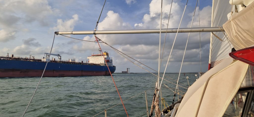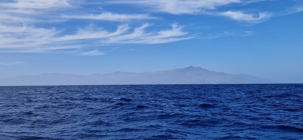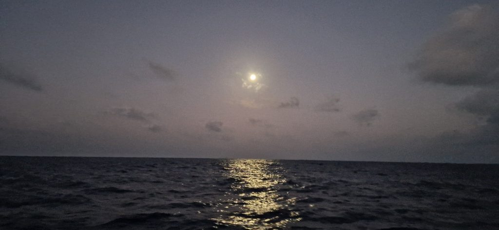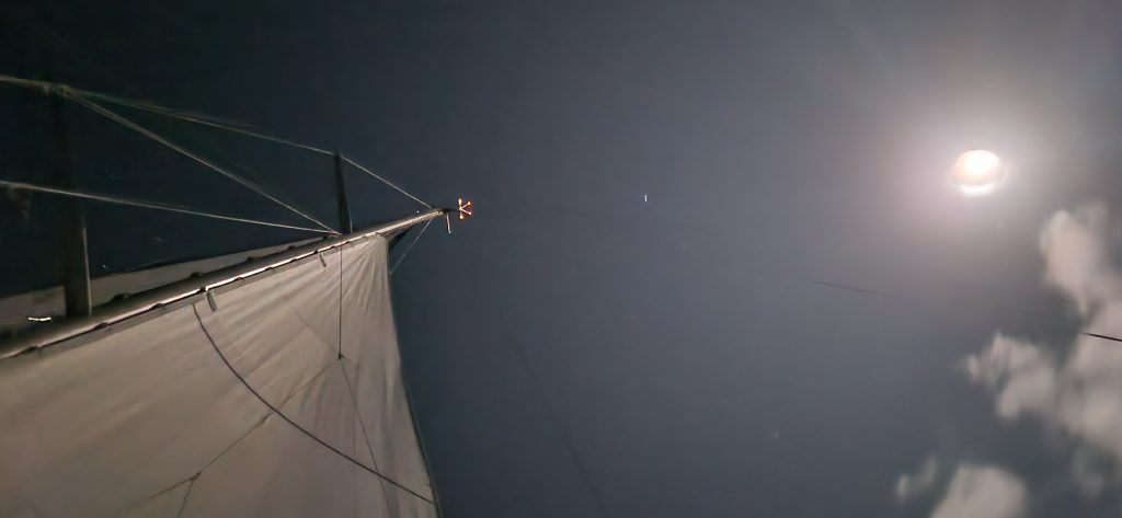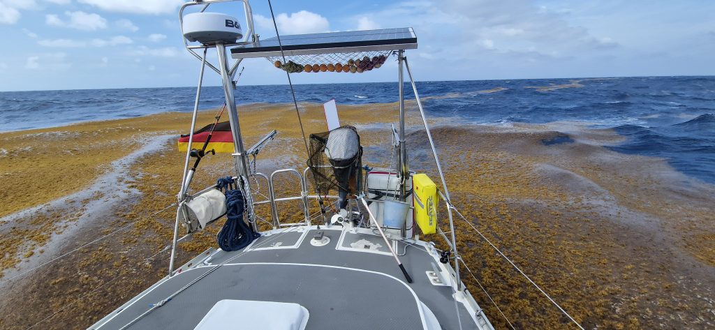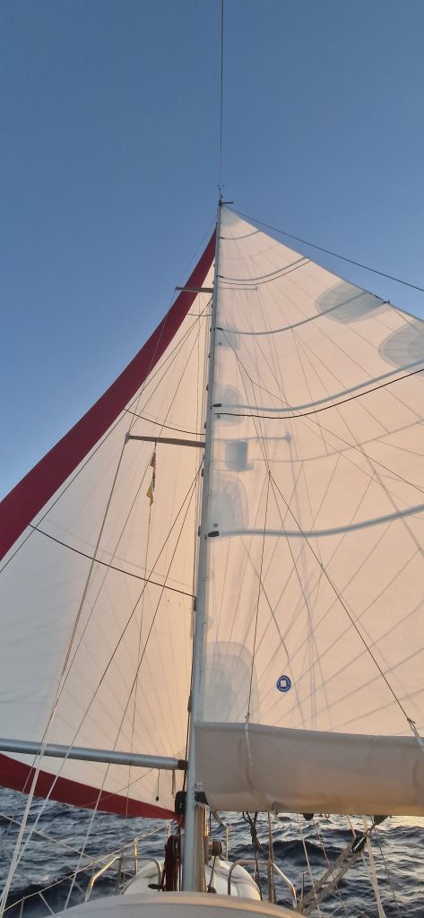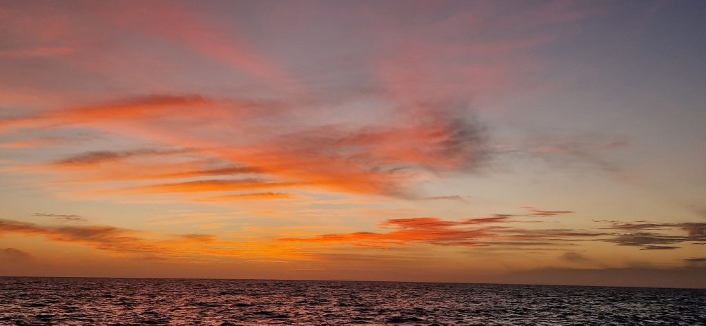 7 Sonntag: Der Tag hat eigentlich angefangen, da hatte der letzte noch nicht aufgehört. Um dreiviertel Zwölf (viertel vor Zwölf für alle nicht Bayern), war der Start zum Durchqueren einer Regenfront. Das volle Programm folgte mir Starkwind, Winddrehern und natürlich Regen. Eben mal das Schiff weiter in den Wind drehen, um sicher vor einer Patenthalse zu sein, Genua bergen und der Spaß konnte beginnen. Ich glaube das war so die erste richtige, natürliche Süßwasserspülung unseres Bootes seit Hamburg, unglaublich. Gegen 3 Uhr (wir reden hier übrigens immer von unserer Bootszeit die wir auf UTC-Time festgelegt haben, um jegliche Verwirrungen mit Zeitumstellung aus dem Weg zu gehen) war der Spuk dann vorbei. Zurück geblieben sind die Wellen und ein zu schwacher Wind, der die Segel bei dem Geschaukel richtig füllt. Das schlagen der Segel gibt wieder mal den Takt an. Ich mach mich dann mal in die Koje und Sabine übernimmt die Wache. Diese war dann irgendwann so angenervt, daß sie die Genua wieder geborgen hat, bei stärker aufkommenden Wind wieder raus geholt, geborgen bei wenig Wind, und ….. Zum Morgengrauen hat sich dann wieder mal zur Abwechslung ein kleiner Schauer ergeben. Bei 29,5 Grad Wassertemperatur (Luft wahrscheinlich noch etwas mehr) und hoher Luftfeuchte dampfen wir so vor uns hin und gegen 9 Uhr kommt dann Final die Genua wieder einmal raus, schließlich wollen wir ja auch möglichst zügig vorankommen, auch wenn uns aktuell ein leichter Gegenstrom von 1,2 kn etwas ausbremst. Und da im Moment kein Seegras zu sehen ist, darf die Angel auch wieder mal ihr Glück probieren.