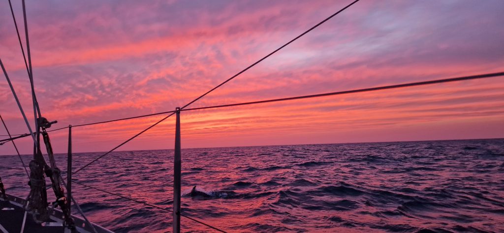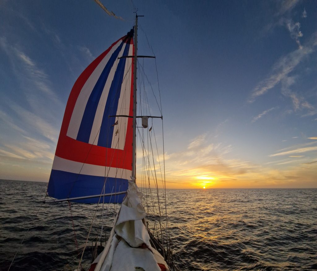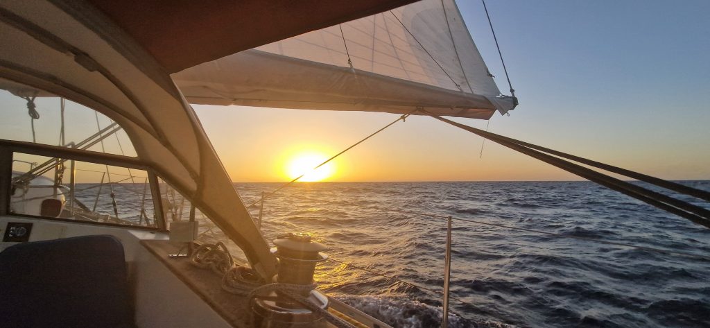 8 Montag: Der Wind dreht auf Ost und wir können endlich mal von Raumschot- auf Halbwindkurs ändern. Das ewige Gerolle lässt damit nach, auch die Welle wir weniger, da sich der Wind so bei 4 Bft einpendelt. Hier in der Konvergenzzone, wo der Nordostpassat und der Südostpassat aufeinandertreffen ist es aber auch so ein Glücksspiel mit den Winden. Fährt man zu weit östlich durch diese Zone, kann es passieren das man durch ein sehr großes Flautenloch kommt, durch das der Motor zur Hilfe genommen werden muss. Je weiter westlich wird diese „Gefahr“ geringer, auszuschließen ist es aber trotzdem nicht. Bei uns ist es aktuell so, daß der Südostpassat, nachdem er zum Teil komplett eingeschlafen war, noch nicht richtig wieder in Gang gekommen ist. Wir haben hier momentan eine Windstärke von 3 Bft, in Böen mal die vier, die er normalerweise recht Konstant mit sich bringt. Wollen wir uns aber mal nicht beklagen, immerhin können wir segeln. So wie sich der Tag gegeben hat, konnte sich aber keiner der Winde so recht entscheiden, wer jetzt das Sagen hat, mal der Eine, mal der Andere. So gleich unsere Kurslinie heute der Spur eines Betrunkenen, immer schön eine Schlangenlinie gleichkommend. Hinzu kommt noch in der Zone das es vermehrt zu sogenannten „Squals“ kommt. Kleine Regenfelder mit ordentlich Wind und Regen, davon sind wir aber bisher verschont worden, wir hatten eigentlich nur eine komplette Regenzone mit gelegentlichen Schauern. Ansonsten war der Tag recht ereignislos, wir dachten schon, daß es hier auch keine Tierwelt gibt. Meiden die das Gebiet?! Hatten wir doch die letzten Tage ständig fliegende Fische gesehen, heute keinen einzigen. Unsere Angelköder geniest scheinbar auch nur das Bad im 29 Grad warmen Wasser, kein Fisch interessiert sich für diesen, als uns zumindest am späten Nachmittag doch noch eine Delphinschule besuchen kommt.
