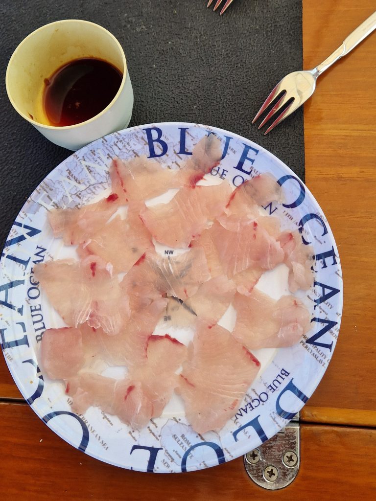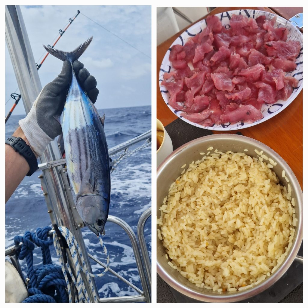 11 Donnerstag: Zu Berichten gibt es eigentlich nicht viel. Dem Südostpassat ist eingefallen, daß er ja auch noch da ist und so sind wir seit den Morgenstunden bei 15kn/ 4Bft unterwegs und unsere Dicke kann bei Halbwind wieder mal zeigen, was sie kann. So fahren wir mit 6,5 bis 7,5 kn Fahrt unserem Ziel entgegen. Das, wie soll es auch anders sein, wir mitten in der Nacht erreichen werden. Am Nachmittag schlägt auch unsere Angel endlich wieder mal an. So gibt es heute zum Abend unseren ersten, kleinen aber feinen, Thunfisch in Form von Sushi. Genau die richtige Größe für Zwei zum Essen für den Abend.