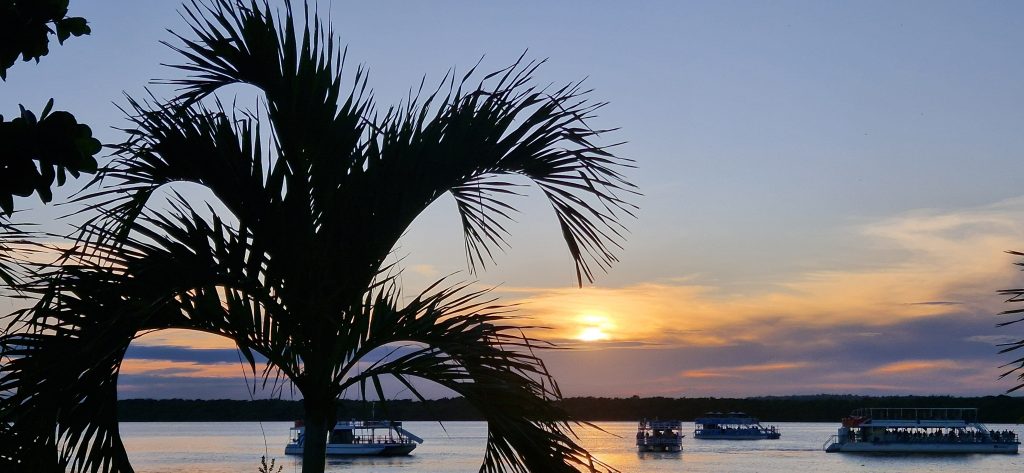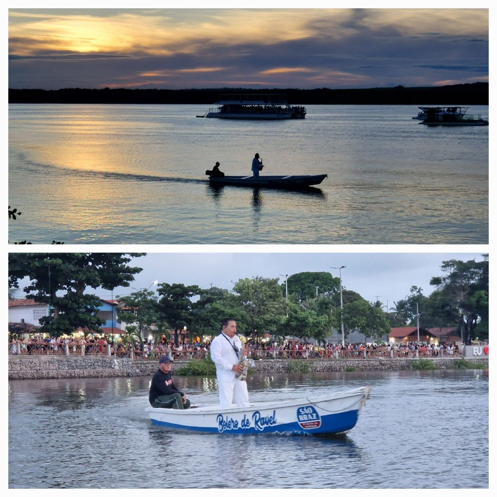 Am Abend fahren wir dann mit der MARGNA-Crew im Dinghi zum abendlichen Bolero-Event. Hier am Flußufer von Jacaré wird jeden Abend von einem Saxophonspieler auf einem kleinen Motorboot zum Sonnenuntergang der Bolero von Ravel gespielt. Ein großes Spektakel, zu dem täglich viele Brasilianer anrücken. Das Flußufer ist in diesem Abschnitt eine Flaniermeile mit Souvenirshops, Getränke- und Essensbuden und könnte auch auf Malle sein. Dieser Abschnitt ist etwa 200 Meter lang, davor und dahinter ist sonst nix. Es war aber auch echt nett, ihm zuzuhören, wie er da so durch das Ankerfeld der brasilianischen Ausflugsboote tuckert und spielt.