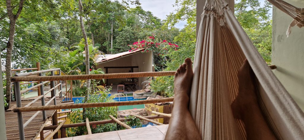 Die Anfahrt zur besagten Pousada war dann sehr spannend. Im Örtchen erst mal Kopfsteinpflaster, dann Piste mit Auswaschungen. Aber was haben wir wieder Schönes ausgesucht! Eine nette kleine Pension mit Pool(chen), Hängematten und einer supernetten und aufmerksamen Gastgeberfamilie. Sie Portugiesin, er Argentinier. Nachdem Kerstin und Mike von der Salto auch auf dem Weg hierher waren, habe ich gleich mal angefragt, ob denn evtl. noch ein Zimmer frei wäre und habe die Info an Kerstin weitergegeben. Diese haben sich dann auch entschlossen, hier abzusteigen. Somit waren wir wieder mal zu viert unterwegs.