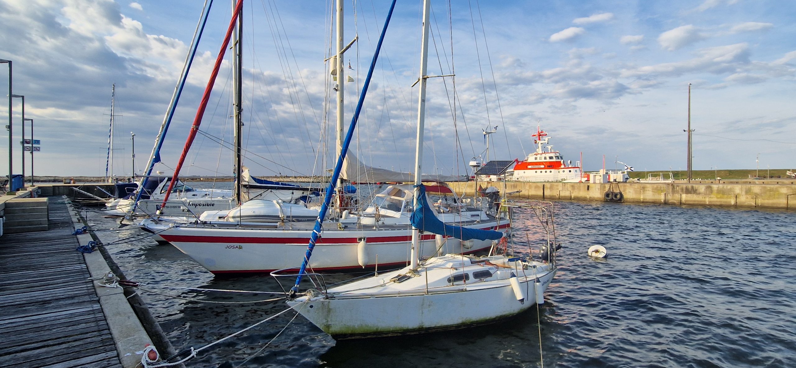 Da dieser Hafen hier sehr eng ist, was die Muringtonnen angeht und unsere Dicke ja sehr anfällig ist für Seitenwind beim manövrieren, sollte diese Uhrzeit gut sein. Noch kein Wind da und wir sind zu dritt, um die Leinen ordentlich zu führen, so daß Jochen die Dicke entspannt vom Steg wegbugsieren kann. Ja, denkste.