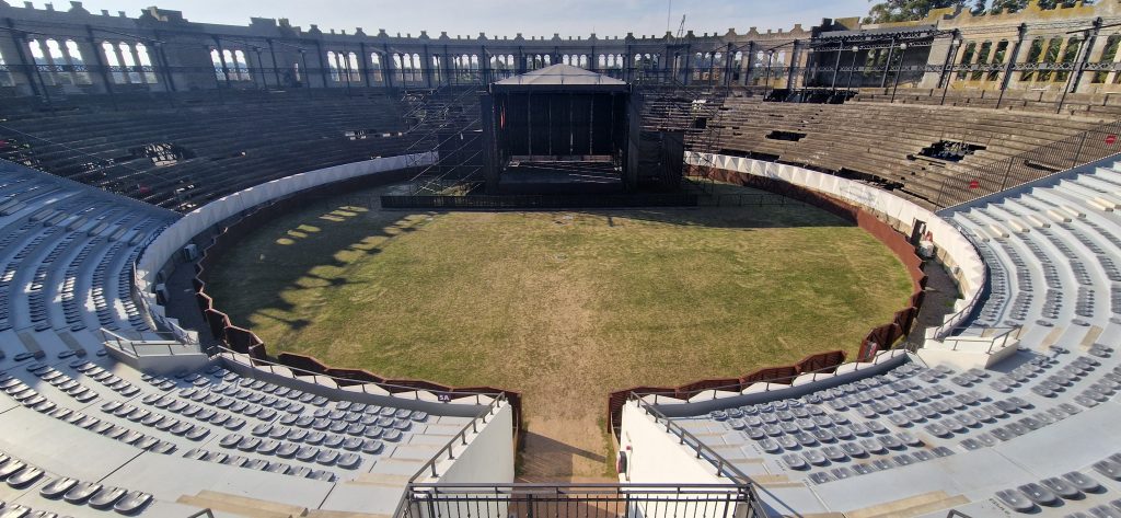 Nachdem wir alles gesehen hatten, sind wir mit dem Auto noch zur alten Stierkampfarena „Plaza de Torros“ gefahren, da diese etwa 5 km weit weg liegt. Das wollten wir nicht zu Fuß angehen, da wären wir im Stockdunkeln zurückgestolpert. Diese schaut wirklich eindrucksvoll aus, vor allem da komplett außenherum der Kreisverkehr geführt ist. Ein Teil der Arena ist bereits renoviert und man kann hineingehen. Viel bekommt man allerdings nicht zu sehen. Man kann 2 Stockwerke nach oben und von den Rängen hinunterschauen. Die Arena selbst wird wohl für Veranstaltungen genutzt, denn es war eine Bühne aufgebaut. Im Ring unter den Tribünen sind verschiedene Geschäfte, Restaurants und Ausstellungen anzusehen. Ganz nett, aber nicht muß. Hier wird eher versucht, den Besuchern neben den fälligen Eintritt noch irgendwie anders Geld abzuluchsen.