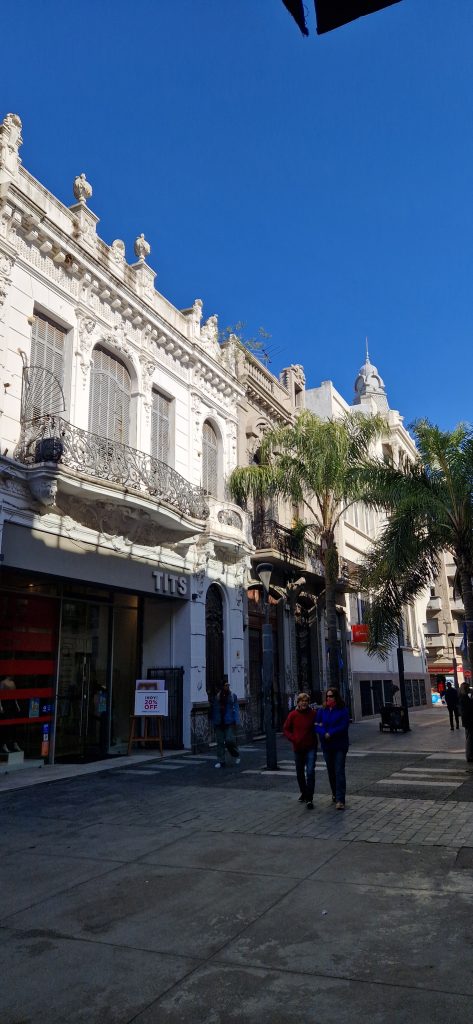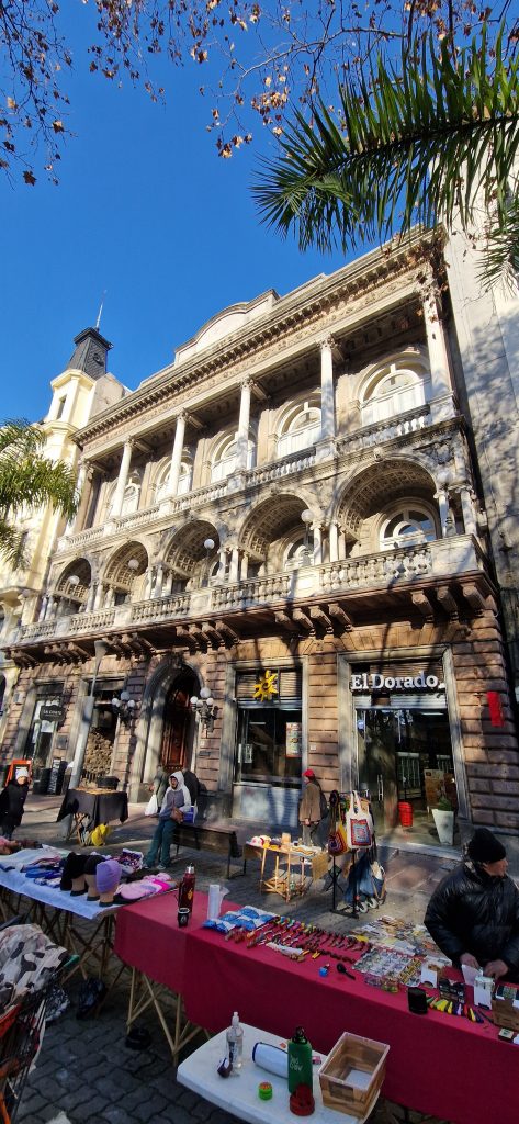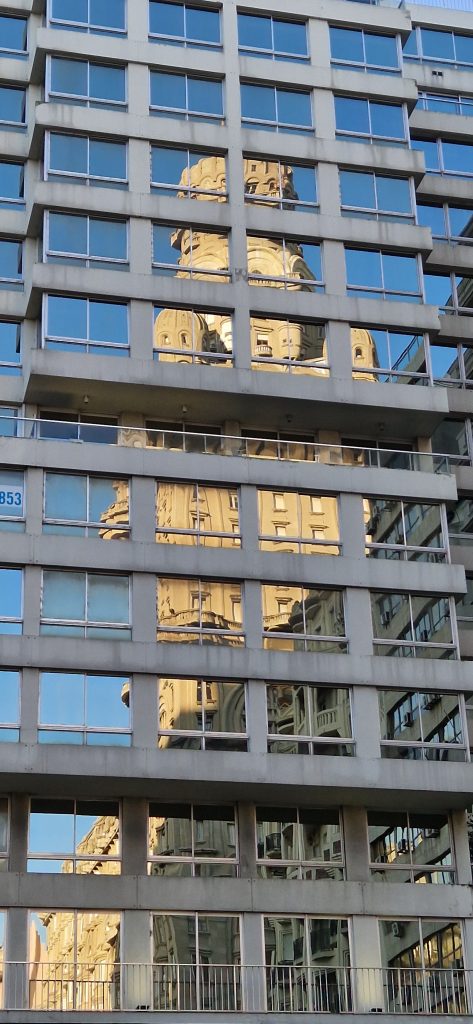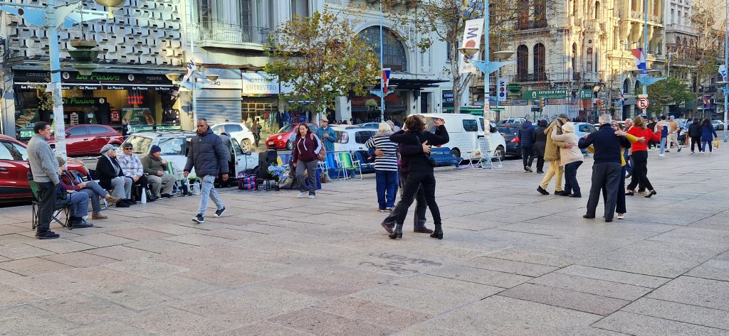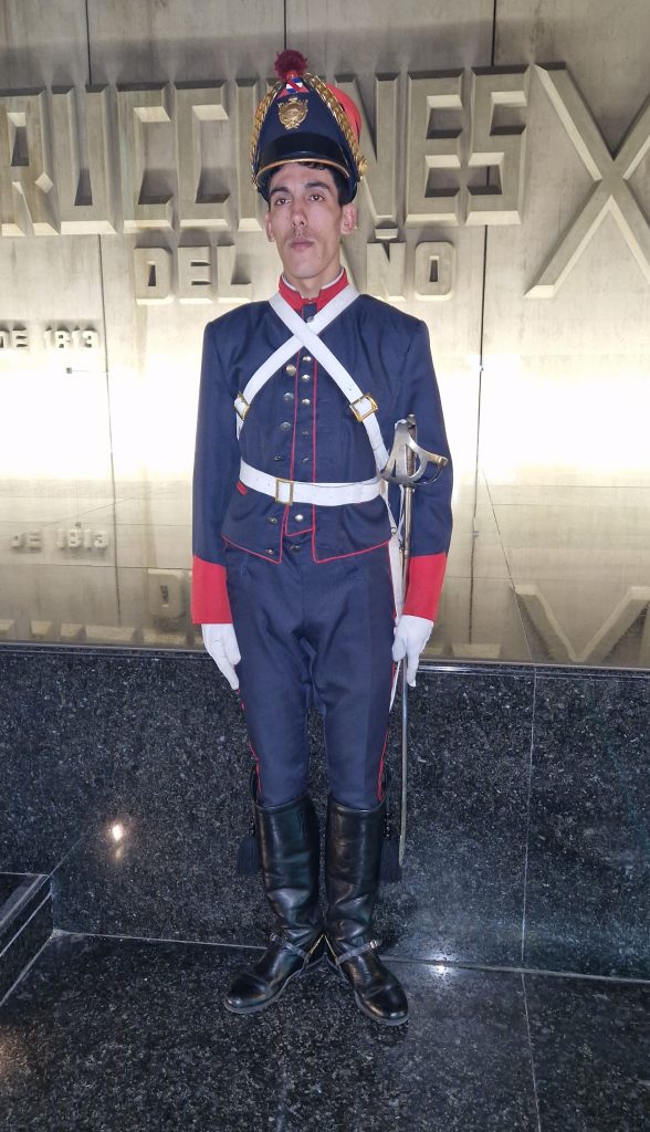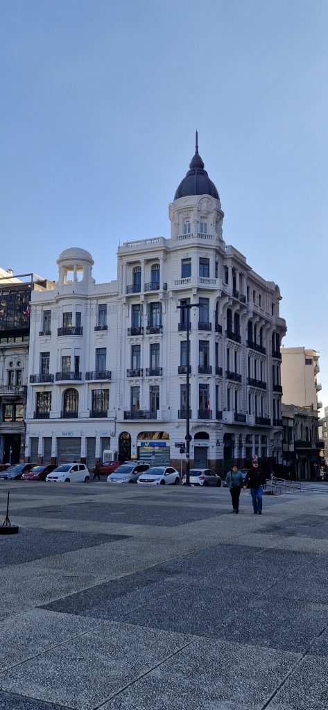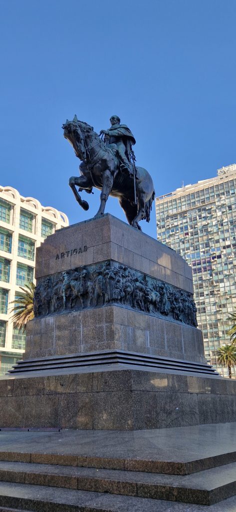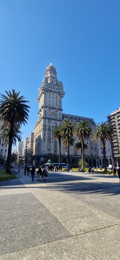 Herr Artigas ist in Uruguay ein Nationalheld und wird als „Vater der Unabhängigkeit Uruguays“ bezeichnet. Seine Denkmäler finden sich hier in jeder Stadt. Hier an diesem Plaza ist unter der Erde sein Mausoleum. Steht doch während der mehrstündigen Öffnungszeiten immer eine Ehrenwache! (Jochen hat gar nicht bemerkt, daß das lebende Männer waren 😊. Er dachte, das wären Puppen). Über dem Mausoleum ist wieder eine große Reiterstatue von Artigas. Hier an diesem Platz befindet sich auch eines der höchsten Gebäude Uruguays, das Palacio Salvo, in dem auch das Tango-Museum untergebracht ist. Es ist nicht wirklich schön, aber doch beeindruckend.