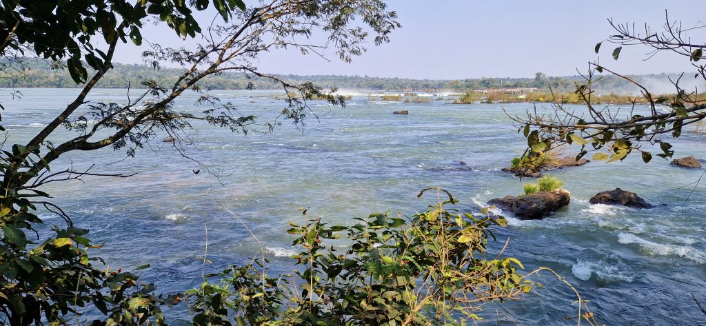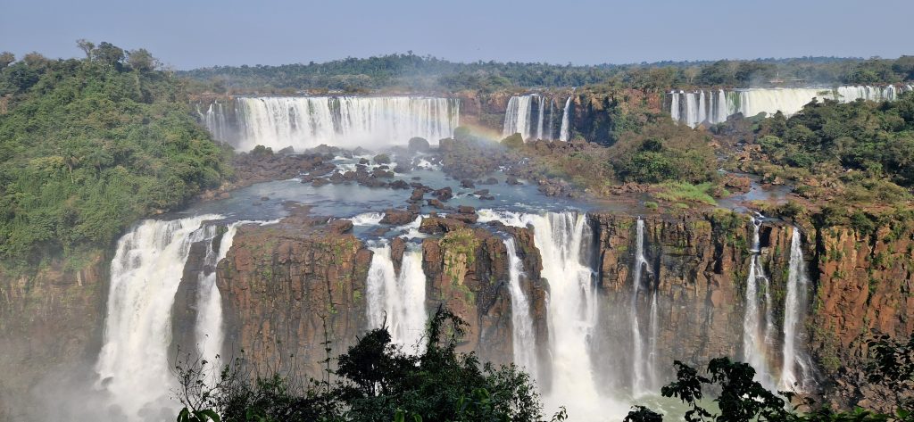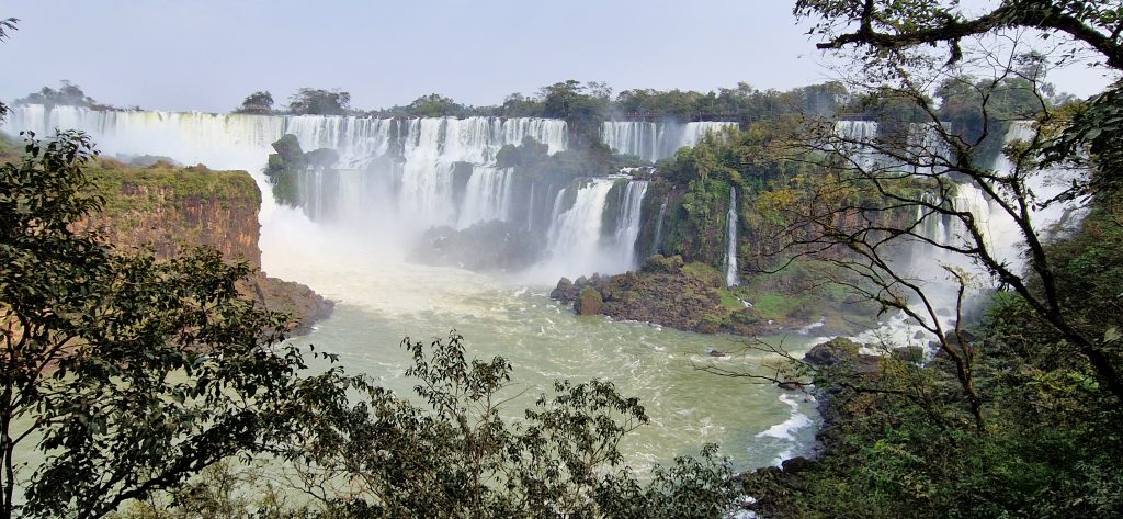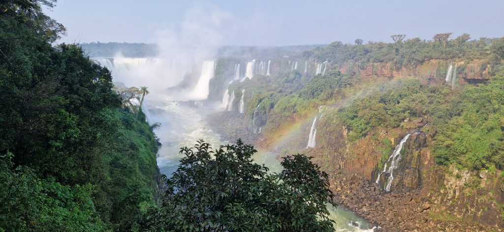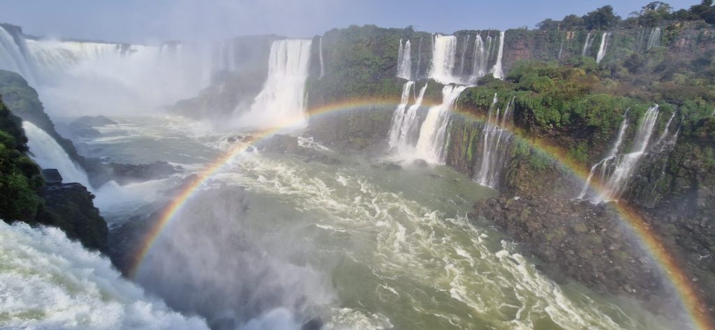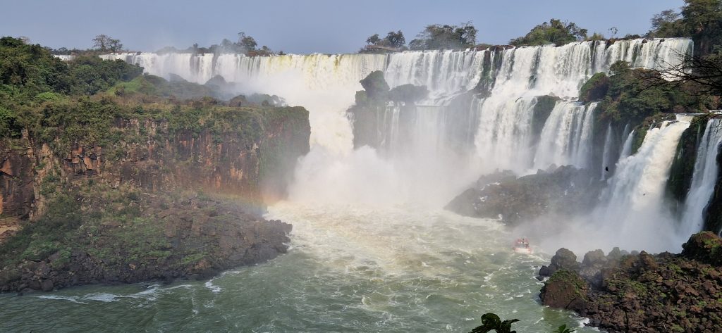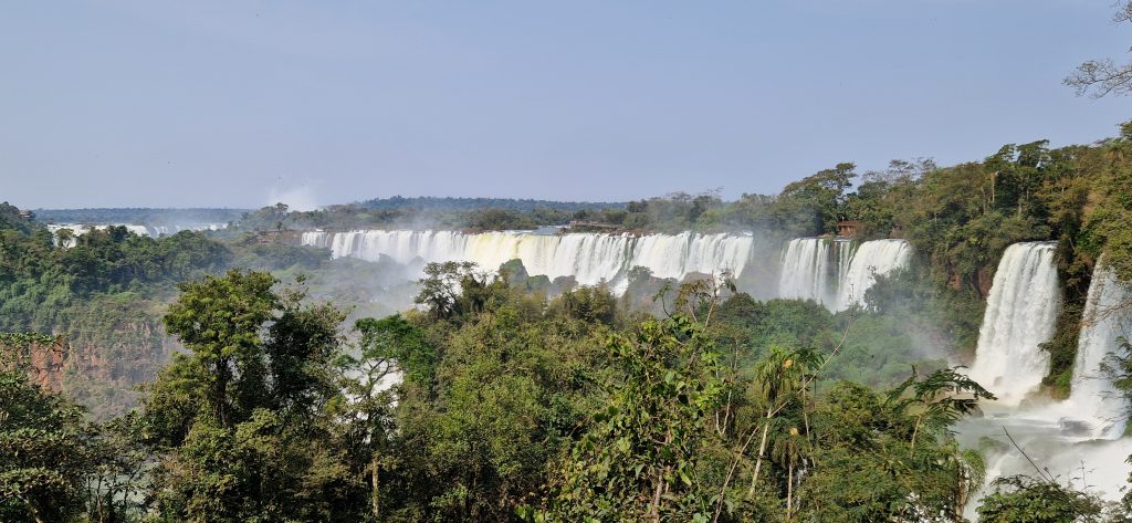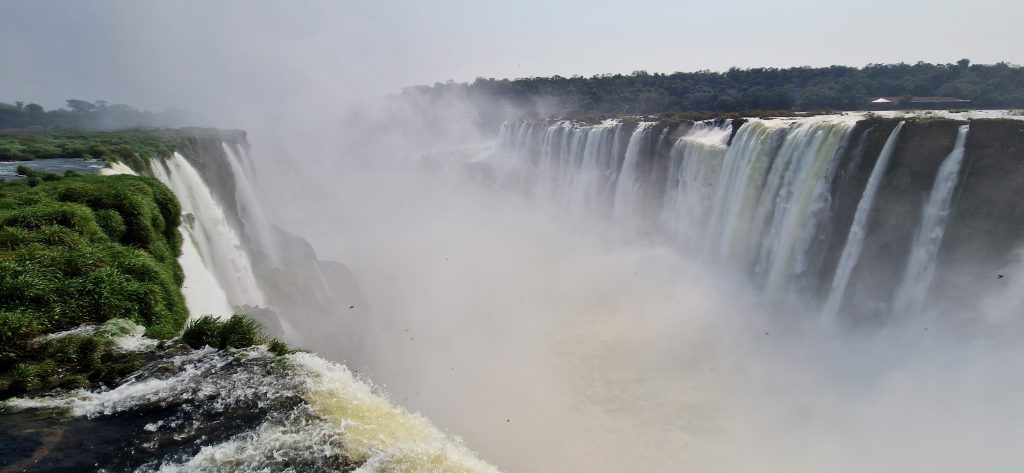So war es jetzt an der Zeit das Ganze zu planen. Zuerst galt es abzuklären, wie wir diesen Trip durchführen wollen – mit Flugzeug, Bus oder Auto. Preislich geben sich alle Möglichkeiten nicht viel. Zu fliegen wäre schnell und einfach, sehen vom Land tut man halt nichts. Mit dem Bus würde man was sehen, wäre auch einfach zu bewerkstelligen, und mit den hier üblichen Überlandbussen, die Liegesitze oder aber auch Schlafabteile haben, auch recht komfortabel. Letztendlich haben wir uns dann doch für das Auto entschieden, Hauptgrund ist und bleibt die Flexibilität, die wir dabei haben, sowohl in der Zeit als auch der Route. So haben wir ein paar Preise verglichen und sind wieder bei dem Anbieter Localiza gelandet, auch wegen der guten Erfahrungen bisher. Gesagt, getan haben wir nach unser Stadtbesichtigung, sofern wir jetzt erst einmal genug gesehen hatten, uns ein Auto gemietet. So sind wir dann am Donnerstag gestartet. Geplant für die Anreise haben wir gleich mal 2 Tage, am ersten Tag war ja Auto abholen und auch noch beladen angesagt, und bei 1300 km Strecke ist das bei den hiesigen Verhältnissen nicht zu schaffen. Im Vorfeld gleich noch auf halber Strecke ein Hotel vorgemerkt und los, mal schauen ob wir das heute schaffen. Wie wir dann unterwegs feststellten, sind die Straßenverhältnisse nicht schlecht und die Geschwindigkeitsbegrenzungen, mit 110 bis 130, erstaunlich hoch; unser anvisiertes Ziel konnten wir so erreichen. Die Unterkunft wurde dann unterwegs noch online gebucht und bis 18:30 Uhr waren wir vor Ort. Wie sich herausgestellt hat, war dieses Appartement leider direkt an einer viel befahrenen Straße, Schlafzimmer natürlich auch dorthin ausgerichtet. Aber für einen Nacht sollte es ja gehen. So sind wir dann am nächsten Morgen, nach einer nicht ganz so erholsamen Nacht (der Nachbar hat dann auch noch, zu allem Überfluss, ab 4 Uhr mal laut Musik angemacht), zum nächsten Bäcker, um uns dort ein Frühstück zu gönnen. Der weitere Weg war dann auch genauso gut zu fahren, vorbei an kleinen Ortschaften und auch vereinzelt etwas Größere. Am späten Nachmittag sind wir dann in Port Iguazu angekommen, mit der Erfahrung der letzten Übernachtung wollten wir uns erst mal ein Bild von der gewählten Übernachtung machen, bevor wir hier für 3 Nächte bleiben wollen. Die Erwählte war dann auch in einer Seitenstraße gelegen, ohne viel Verkehr und auch gleich mit Frühstück. Das positive, was es auch mit jedem Kilometer weiter in den Norden mit sich gebracht hat, es wurde wärmer, wir hatten bei Ankunft 28°. Was für eine Wohltat wieder mal am Abend nur mit Shirt und kurzer Hose unterwegs zu sein. Was wir natürlich wieder vergessen hatten: es ist Wochenende. Irgendetwas ist ja immer, das man bei der Planung vergisst. So sind wir dann schon recht bald los, um wenigstens dem größten Rummel am Anfang aus dem Weg zu gehen, gedauert hat es dann trotzdem bis wir im Nationalpark waren, wir mussten 3x mal anstehen. Zuerst, klar, an der Kasse, dann nochmal am Einlass und schlussendlich an der kleinen Eisenbahn, die uns die ersten Kilometer in den Park gebracht hat. Von hier war dann alles gut zu Fuß zu erreichen. Die Hauptattraktion, der GROSSE Wasserfall, war dann über eine weitläufige Steganlage zu erreichen. Geht es zuerst noch über den ruhigen Teil vom Flusslauf, wird das Getose immer lauter, bis diese zu einer Plattform reicht, an der man den Eindruck hat, man steht mitten in den sich hinabstürzenden Wassermassen, ein unbeschreibliches Erlebnis. Die Gischt die dabei entsteht, versperrt einen die meiste Zeit den Blick bis hinunter, wo sich das Wasser wieder zu einem Fluss zusammenschließt. In den Winden, die sich hier bilden sind unzählige Vögel unterwegs, die man ebenfalls bei ihren flugakrobatischen Einlagen bestaunen kann. Ihre Nester befinden sich wohl in dem Grün, das sich erstaunlicherweise an einigen Stellen der Felswand festkrallt, ich könnte dem ganzen Spektakel noch Stunden zuschauen. Aber schließlich ziehen wir dann irgendwann weiter, es gibt ja noch so einiges andere zu entdecken hier.