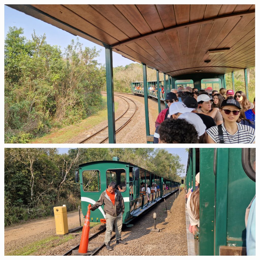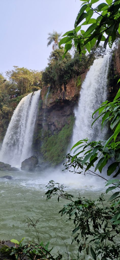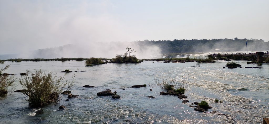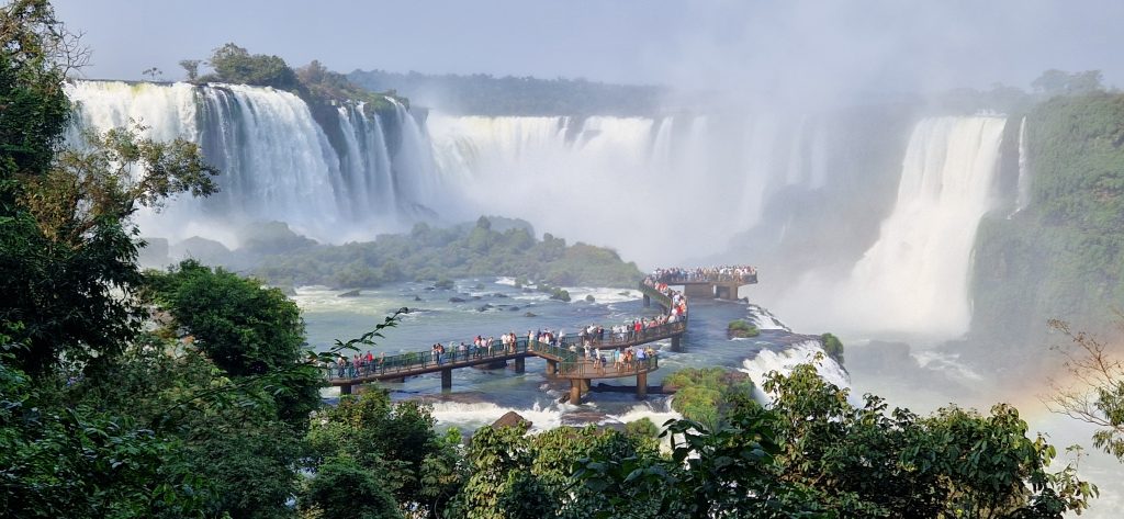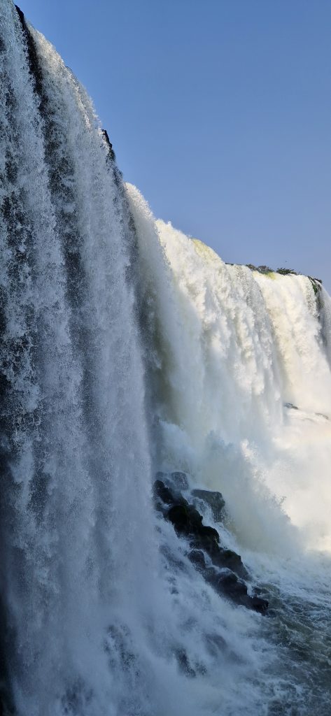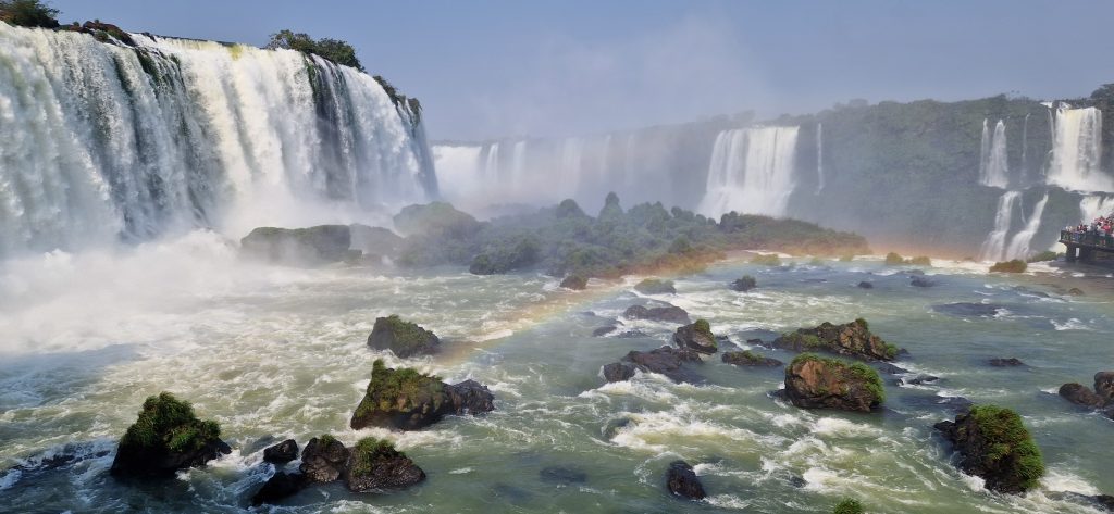 So war es jetzt an der Zeit das Ganze zu planen. Zuerst galt es abzuklären, wie wir diesen Trip durchführen wollen – mit Flugzeug, Bus oder Auto. Preislich geben sich alle Möglichkeiten nicht viel. Zu fliegen wäre schnell und einfach, sehen vom Land tut man halt nichts. Mit dem Bus würde man was sehen, wäre auch einfach zu bewerkstelligen, und mit den hier üblichen Überlandbussen, die Liegesitze oder aber auch Schlafabteile haben, auch recht komfortabel. Letztendlich haben wir uns dann doch für das Auto entschieden, Hauptgrund ist und bleibt die Flexibilität, die wir dabei haben, sowohl in der Zeit als auch der Route. So haben wir ein paar Preise verglichen und sind wieder bei dem Anbieter Localiza gelandet, auch wegen der guten Erfahrungen bisher. Gesagt, getan haben wir nach unser Stadtbesichtigung, sofern wir jetzt erst einmal genug gesehen hatten, uns ein Auto gemietet. So sind wir dann am Donnerstag gestartet. Geplant für die Anreise haben wir gleich mal 2 Tage, am ersten Tag war ja Auto abholen und auch noch beladen angesagt, und bei 1300 km Strecke ist das bei den hiesigen Verhältnissen nicht zu schaffen. Im Vorfeld gleich noch auf halber Strecke ein Hotel vorgemerkt und los, mal schauen ob wir das heute schaffen. Wie wir dann unterwegs feststellten, sind die Straßenverhältnisse nicht schlecht und die Geschwindigkeitsbegrenzungen, mit 110 bis 130, erstaunlich hoch; unser anvisiertes Ziel konnten wir so erreichen. Die Unterkunft wurde dann unterwegs noch online gebucht und bis 18:30 Uhr waren wir vor Ort. Wie sich herausgestellt hat, war dieses Appartement leider direkt an einer viel befahrenen Straße, Schlafzimmer natürlich auch dorthin ausgerichtet. Aber für einen Nacht sollte es ja gehen. So sind wir dann am nächsten Morgen, nach einer nicht ganz so erholsamen Nacht (der Nachbar hat dann auch noch, zu allem Überfluss, ab 4 Uhr mal laut Musik angemacht), zum nächsten Bäcker, um uns dort ein Frühstück zu gönnen. Der weitere Weg war dann auch genauso gut zu fahren, vorbei an kleinen Ortschaften und auch vereinzelt etwas Größere. Am späten Nachmittag sind wir dann in Port Iguazu angekommen, mit der Erfahrung der letzten Übernachtung wollten wir uns erst mal ein Bild von der gewählten Übernachtung machen, bevor wir hier für 3 Nächte bleiben wollen. Die Erwählte war dann auch in einer Seitenstraße gelegen, ohne viel Verkehr und auch gleich mit Frühstück. Das positive, was es auch mit jedem Kilometer weiter in den Norden mit sich gebracht hat, es wurde wärmer, wir hatten bei Ankunft 28°. Was für eine Wohltat wieder mal am Abend nur mit Shirt und kurzer Hose unterwegs zu sein. Was wir natürlich wieder vergessen hatten: es ist Wochenende. Irgendetwas ist ja immer, das man bei der Planung vergisst. So sind wir dann schon recht bald los, um wenigstens dem größten Rummel am Anfang aus dem Weg zu gehen, gedauert hat es dann trotzdem bis wir im Nationalpark waren, wir mussten 3x mal anstehen. Zuerst, klar, an der Kasse, dann nochmal am Einlass und schlussendlich an der kleinen Eisenbahn, die uns die ersten Kilometer in den Park gebracht hat. Von hier war dann alles gut zu Fuß zu erreichen. Die Hauptattraktion, der GROSSE Wasserfall, war dann über eine weitläufige Steganlage zu erreichen. Geht es zuerst noch über den ruhigen Teil vom Flusslauf, wird das Getose immer lauter, bis diese zu einer Plattform reicht, an der man den Eindruck hat, man steht mitten in den sich hinabstürzenden Wassermassen, ein unbeschreibliches Erlebnis. Die Gischt die dabei entsteht, versperrt einen die meiste Zeit den Blick bis hinunter, wo sich das Wasser wieder zu einem Fluss zusammenschließt. In den Winden, die sich hier bilden sind unzählige Vögel unterwegs, die man ebenfalls bei ihren flugakrobatischen Einlagen bestaunen kann. Ihre Nester befinden sich wohl in dem Grün, das sich erstaunlicherweise an einigen Stellen der Felswand festkrallt, ich könnte dem ganzen Spektakel noch Stunden zuschauen. Aber schließlich ziehen wir dann irgendwann weiter, es gibt ja noch so einiges andere zu entdecken hier.