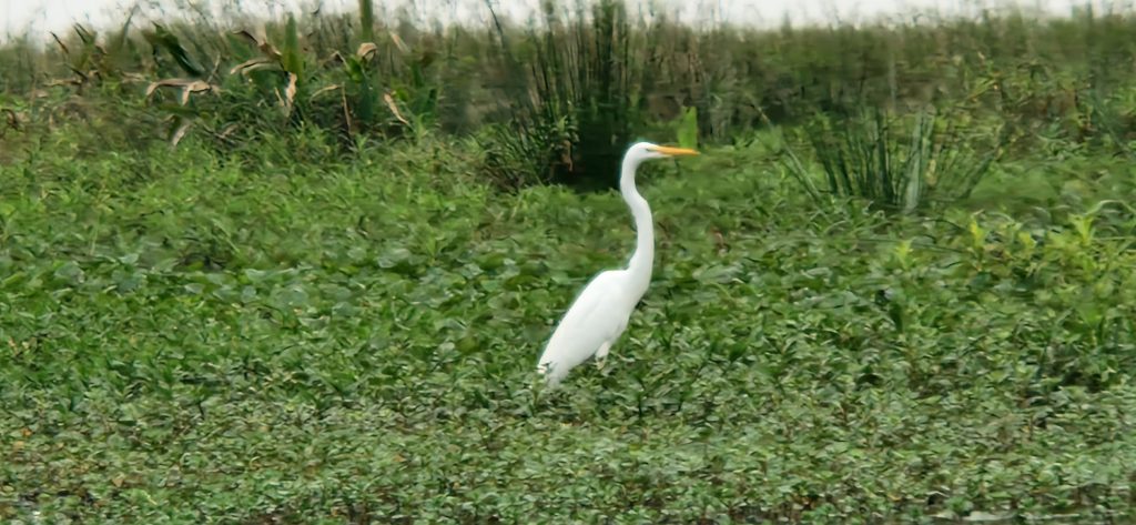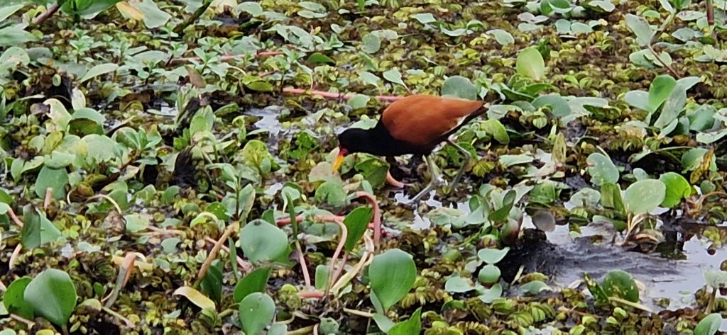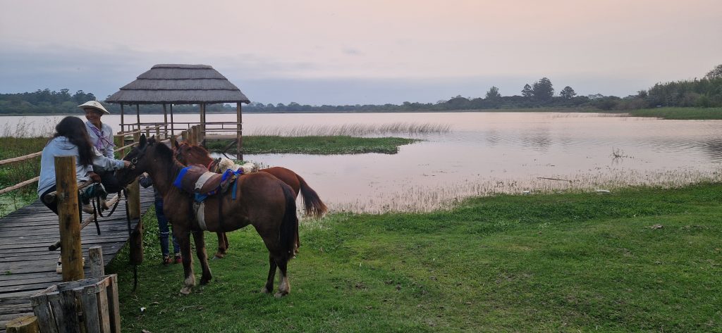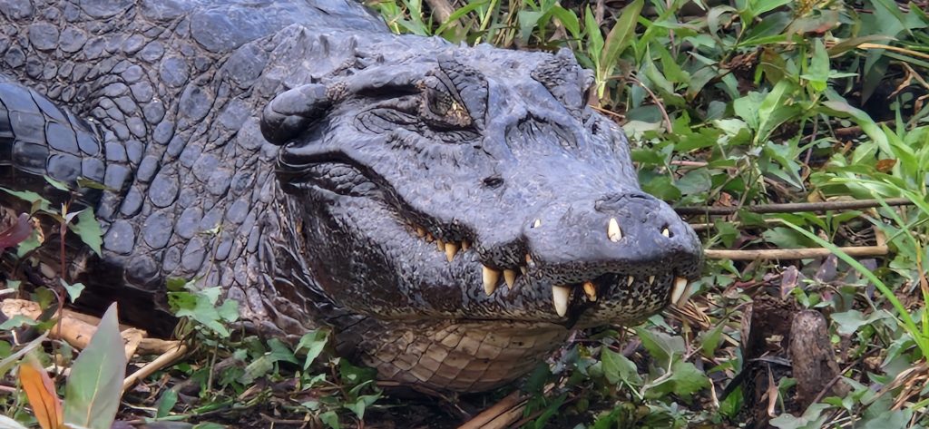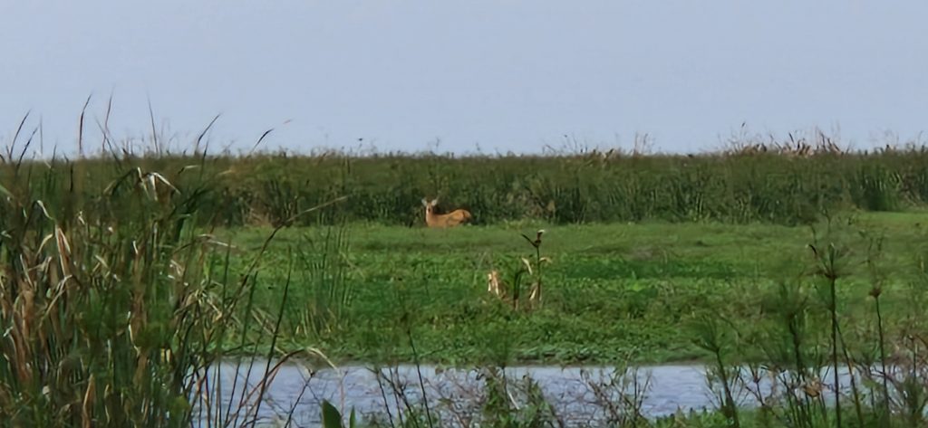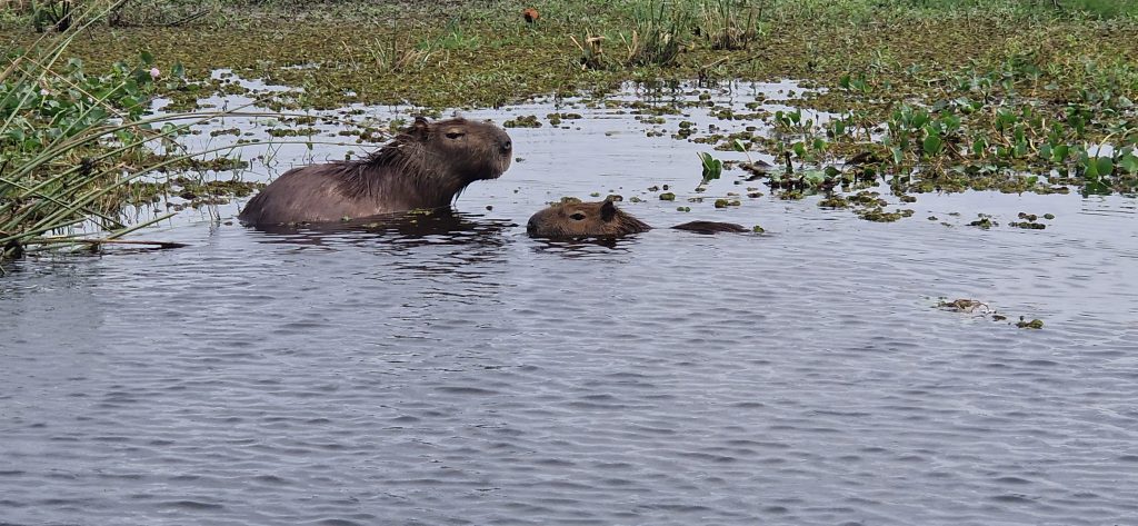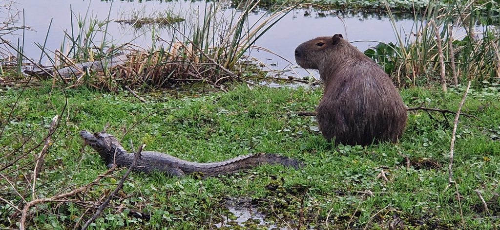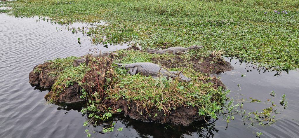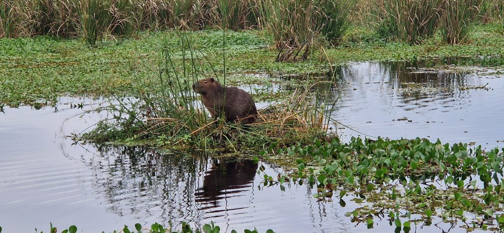 Von hier aus sind wir dann zu unserer Unterkunft für die Nacht gestartet, diese war dann auch schon am Rand des Nationalparks gelegen. Von hier aus hatten wir zu unserem Ausflugsziel, einer gebuchten Bootstour, nur noch 1,5 Stunden zu fahren, die wir dann auch frisch ausgeruht und gestärkt am späten Morgen in Angriff genommen hatten. Auch hier hatten wir von unterwegs online gebucht. So sind wir dann noch an dem kleinen Büro in der Stadt vorbei gefahren, um unsere Schuld zu begleichen und letzte Informationen einzuholen – wo genau die Tour denn startet. Mit Hilfe der netten Dame haben wir uns aus gleich eine Unterkunft am Ort gebucht, bis wir von der Tour zurück sind, könnte es spät werden, die Tour war von 16 bis 18 Uhr angesetzt. Mit der Info sind wir dann noch über 25 Pistenkilometer zu unserem Bootsanleger mitten durch den Nationalpark gefahren, nicht aber uns vorher in einer kleinen Imbissbude für den Rest des Tages zu stärken. So sind wir dann gegen 15 Uhr am vereinbarten Treffpunkt gewesen, noch nicht ausgestiegen ist auch schon unser Tourguide angekommen. „Ja wenn ihr schon da seid, können wir auch gleich starten, ihr seid die einzigen Gäste heute“. Gesagt, getan. Nach der kurzen Vorbereitung, um das Boot startklar zu machen, ging es dann auch schon los. Während wir eben auf das Boot gewartet haben, haben wir uns natürlich im Umfeld schon etwas umgesehen. Plötzlich entdecken wir einen Kaiman direkt im Grünteppich, wo die ganzen Boote liegen, keine 5 m weg von uns. Wir Rätseln noch ob es sich nicht um eine Plastikattrappe handelt, für die Touris halt, „schaut aber echt gut aus, die Attrappe“, als sich das Tier bewegt. Upps, nichts Attrappe, wir haben unseren ersten Kaiman in freier Wildbahn gesehen. Wie wir dann im Laufe der Tour feststellen, sollte es nicht der Letzte gewesen sein, es sind noch unzählige gekommen. Wir haben bei einem Veranstalter gebucht der hier „Pionierarbeit“ leistet, der Einzige der mit Elektroantrieb unterwegs ist. Wir wissen natürlich nicht, ob es daran gelegen war, daß wir so nah an die Tiere herangekommen sind, aber es war schon beeindruckend, zum Teil bis auf ein, zwei Meter heran zu kommen. Genauso viele Kaimane wie es hier gibt, leben diese Seite an Seite mit den Wasserschweinen, von den es ebenso zahlreiche hier gibt. Daß diese tiefenentspannt sind, hatten wir ja schon im Hafen von Itajai feststellen können, wo wir direkt an den Mitbewohnern vorbeigelaufen sind. Ricardo, unser Guide, hat uns auch sehr viel über die Natur hier erzählt und gezeigt. So waren auch neben dem einen oder anderen Vertretern der Vogelwelt, auch noch Sumpfhirsche zu bestaunen. Leider hatten weder wir, noch Ricardo, ein Fernglas dabei, um diese sehr scheuen Tier aus der „Nähe“ zu sehen. So verging die Zeit wie im Fluge, aus den zwei, waren dann auch zweieinhalb Stunden geworden. Er hat wohl auch gemerkt, daß wir uns für die Natur wirklich interessieren und nicht nur ein paar Schnappschüsse machen wollten. So sind wir dann mit vielen neuen Eindrücken unseren Rückweg gestartet, auf dem wir dann noch einen örtlichen Fuchs zu Gesicht bekommen haben.