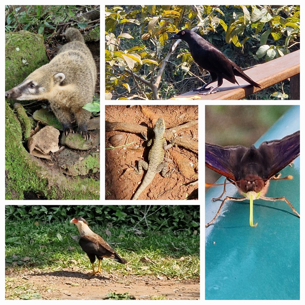 Hier haben wir dann auch das erste Mal Nasenbären gesehen. Diese sind hier leider angefüttert und waren untereinander entsprechend agressiv (Futterneid). Auf argentinischer Seite wurde überall darauf hingewiesen, die Tiere nicht zu füttern und an den Restaurants waren Gitter angebracht, so daß die Tiere nicht an die Tische konnten. Dort hat man diese Tiere dann auch nicht zu Gesicht bekommen. Anders in Brasilien. Da steht man keinen Meter weg von diesen Tieren. Auch hier wieder massenhaft Schmetterlinge, Eidechsen und Vögel.