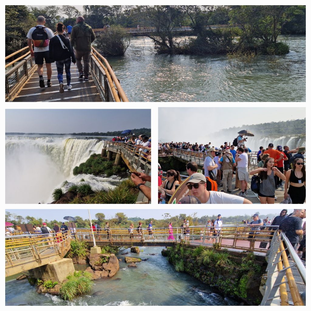 Auch hier auf brasilianischer Seite wieder Menschenmassen. Die Beschilderung hier ist definitiv schon einmal besser wie auf der „anderen“ Seite und auch das Personal ist hier auf Zack und spricht einen gleich an und hilft. Auch hier hieß es, erst mal in den Bus steigen und bis zum Einstieg zu den Wasserfällen fahren. Und wie uns schon angekündigt wurde, sind die Fälle auf brasilianischer Seite ganz anders zu bestaunen. Nun sehen wir das Ausmaß in voller Breite, standen wir doch in Argentinien eher über den Fällen, sind wir hier drüben auch am Grund bzw. auf halber Höhe. Und wir stehen direkt davor und werden entsprechend nass durch die Gischt und den Wind.