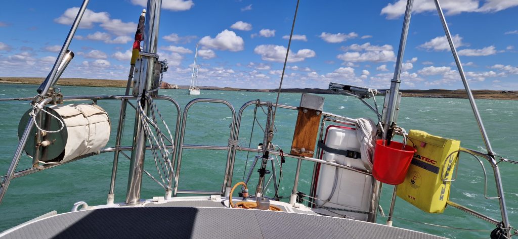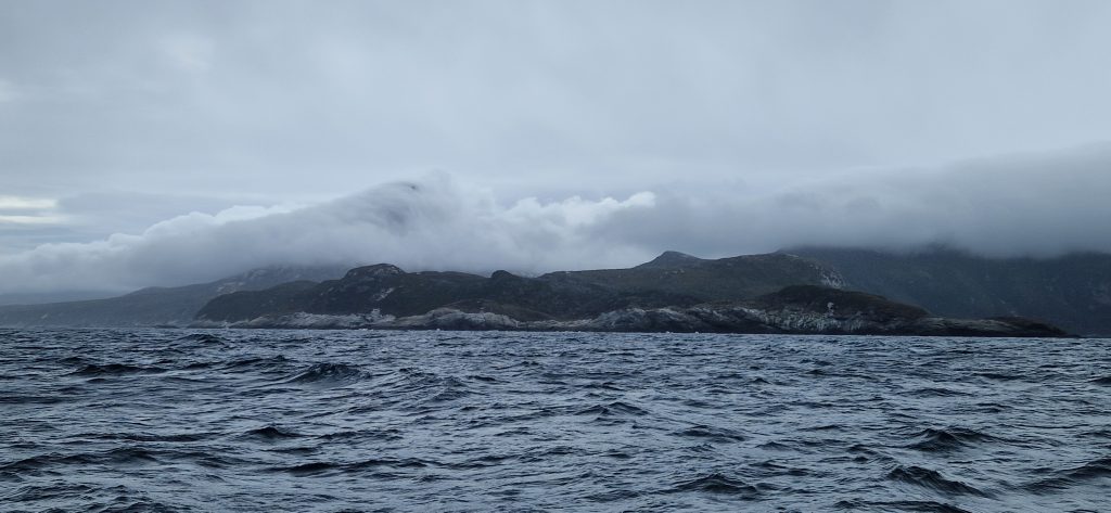 Und es hat wieder einmal sehr gut geklappt. Ganz zum Anfang hatten wir eine kurze Phase von wilden Wellen, als wir aus dem Schatten der Insel um das Kap gefahren sind. Dort haben sich solche aufgebaut, da es hier ein schnell ansteigende Unterwasserlandschaft hat. Aber dann im tiefen Wasser wieder alles easy. Und wir hatten Strömung mit!!! Normalerweise fahren wir unter Maschine circa 5,5 Knoten Marschgeschwindigkeit. Wir hatten dann zeitweise über 10 Knoten Fahrt über Grund auf unserer Anzeige. Eine Strömung von 4 – 5 Knoten hat uns mit angeschoben, in der Spitze waren es 5,8 kn von leicht quer ab, welche uns unsere Instrumente angezeigt haben. So haben wir die 25 Seemeilen der Meerenge schnell passiert und konnten in den Beagle einbiegen. Zwischendurch konnten wir auch mal ein Stück segeln.
