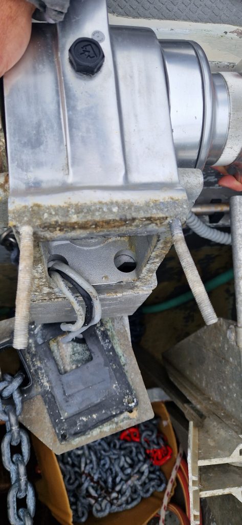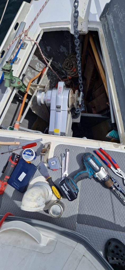 Also neben den üblichen Vorbereitungen für die Hafeneinfahrt (Fender anbringen, Leinen vorbereiten) auch mal den Anker vorbereitet. Vielleicht werfen wir doch lieber erst einmal den und warten auf bessere Bedingungen für die Einfahrt in den Hafen?