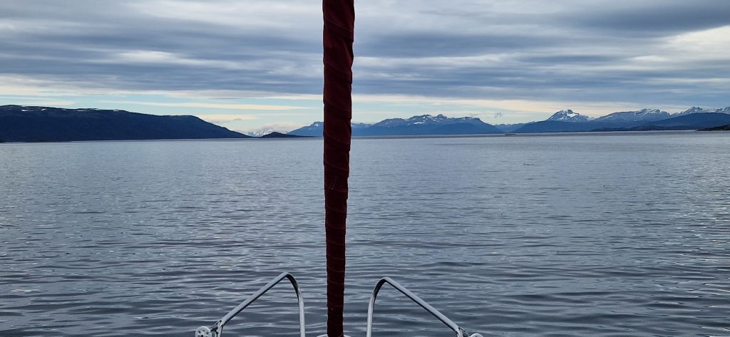 Am nächsten Morgen hieß es bald raus und losfahren. Wir wollten ja heute bis Ushuaia kommen – unserem letzten Ziel in Argentinien. Es war auch gleich wieder ordentlich Wind, so daß wir sofort die Genua gesetzt haben. Tja, aber wir sind halt in einem Kanal mit vielen, hohen Bergen. Wind da, Wind weg, Wind da, starke Böen, Wind von links vorne, Wind von rechts vorne: ein ständiges Gefummel am Segel, aber wir konnten segeln. Irgendwann hatte der Wind aber soweit gedreht, daß er meist nur noch von vorne gekommen ist, das war uns dann zu blöd und wir haben die Genua weggepackt und unser Großsegel im 2. Reff als Stützsegel gesetzt und dazu den Motor wieder angeworfen. Zwischendurch dann mal eine Regenzelle mit Hagel und Windböen bis weit über 30 Knoten. Welcome in Patagonien –wir sind wirklich angekommen!