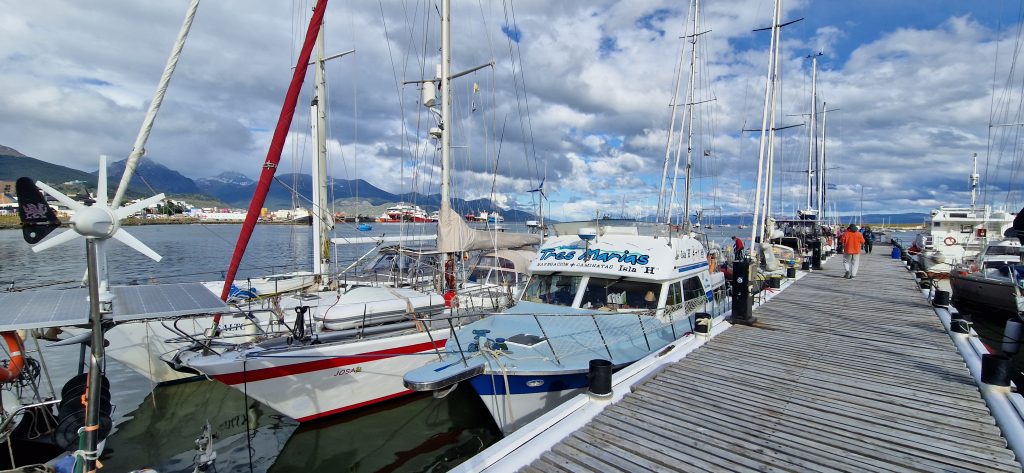 In der Bucht von Ushuaia haben wir ein „Windloch“ genutzt, um das Großsegel wieder zu bergen. Jochen geht an den Mast und will gerade das Segel runter lassen, Schwupps – da ist sie wieder die Böe bis zu 30 Knoten. Oh je, und da wollen wir in die Marina fahren und an einem anderen Schiff anlegen?