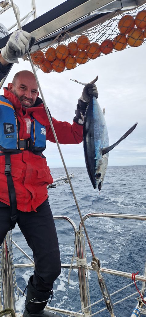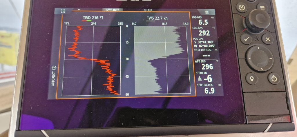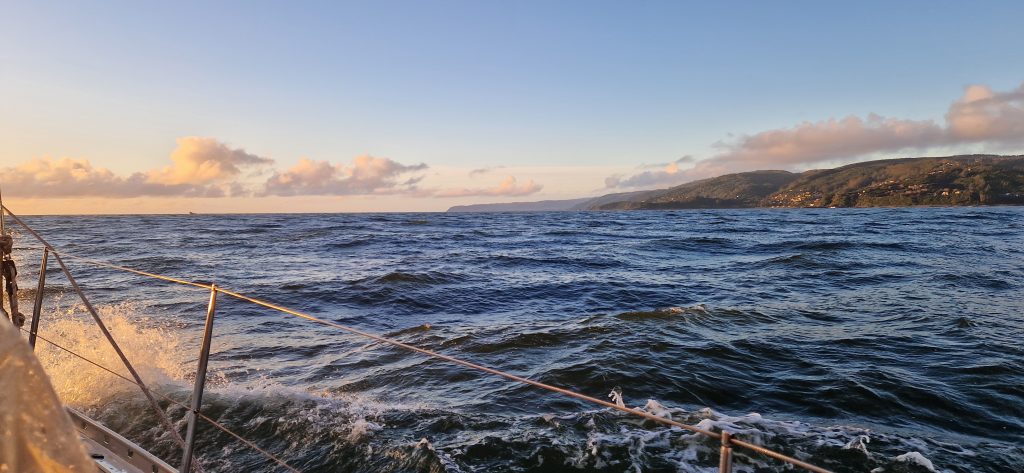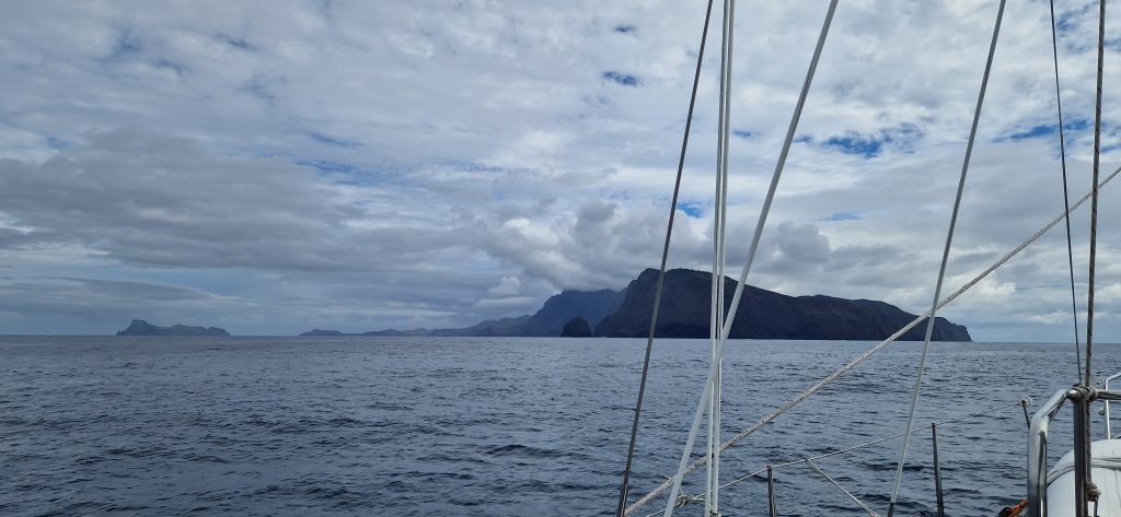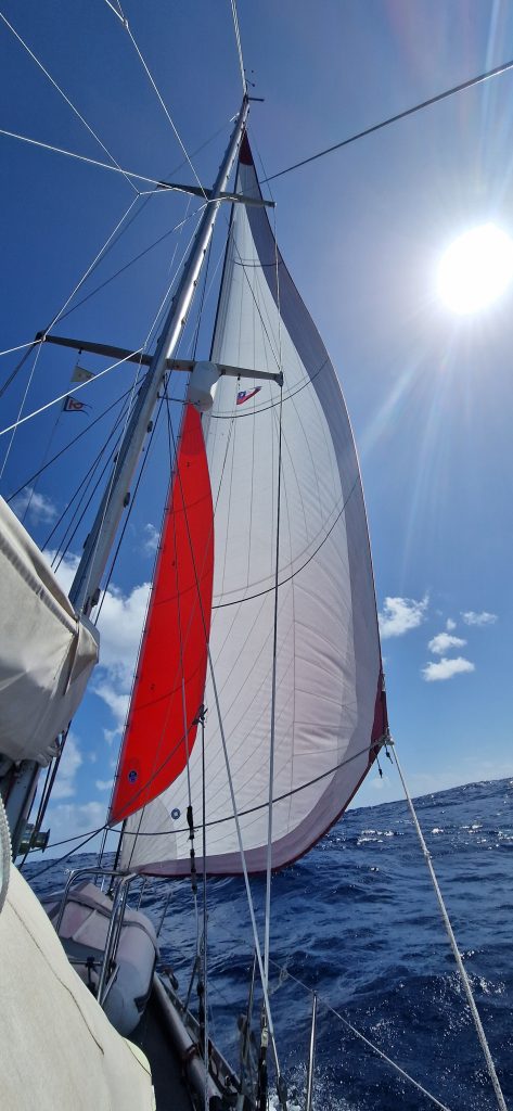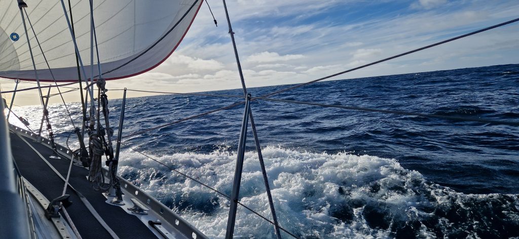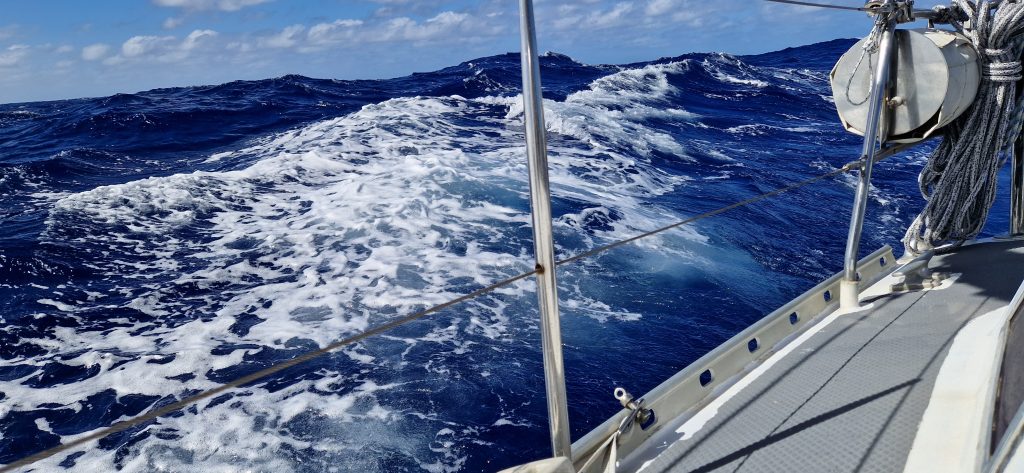 So können wir schnell die Segel setzen, bei der Behörde noch schnell unsere Abfahrt durchfunken und los geht´s. Kaum aus der Landabdeckung draußen ist der Wind auch so kräftig, daß wir die Segel gleich noch etwas weiter reffen müssen als eh schon gemacht. Dann passt alles und so geht es die nächsten 2 Tage ohne weiteres Zutun dahin. Der Wind dreht schließlich immer weiter, nimmt auch noch etwas zu und wir fahren nun hoch am Wind unserem Ziel entgegen. Eine sehr zermürbende Fahrt, sowohl für´s Gemüt als auch für´s Material.