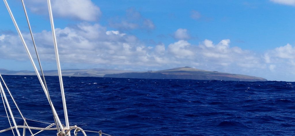 Als der Wind wieder einsetzt, setzen wir doch wieder Kurs auf Ducie Island, wir sind gerade mal 170 sm davon entfernt, wir wären in spätestens 30 Stunden dort. Der Wind würde gut passen, um dorthin zu kommen. Ich checke nochmals alle Für und Wider der Vorhersage, die für die weiteren Tage gemeldet sind und nochmal und nochmal. Schweren Herzens fällt doch der Entschluss, wieder direkten Kurs auf das Gambier Archipel zu nehmen. Zu einem haben wir noch mäßigen Wind, wenn wir an dem Atoll ankommen würden, die Ankerverhältnisse sind völlig unklar, im Zweifel müssten wir trotzdem weiterfahren. Auch für den weiteren Verlauf danach schaut es nicht gut aus. Das nächste Eiland ist Henderson 200 sm weiter, auch hier die Ankerverhältnisse völlig unklar. Um dorthin zu kommen müssten wir auch wieder ein Flautenloch überbrücken. Danach dann wieder kräftiger Wind, vor dem wir uns irgendwo Schutz suchen müssten. Das wäre dann die Pitcairn Insel nochmals weitere 100 sm entfernt, Ankerplatz sehr rollig und ein anlanden an Land nur bei ruhigen Verhältnissen möglich. Alles Dinge, die letztendlich entschieden haben, daß wir diese interessanten Inseln nicht anlaufen werden. Nach zwei Tagen, auf denen wir Raumschot und mit guten Windverhältnissen unterwegs sind macht sich so langsam die uns bevorstehende Flaute bemerkbar, der Wind nimmt langsam aber stetig ab. Gerade am raumen Kurs, wenn der Wind zu wenig wird, rollt das Schiff immer mehr von der einen Seite auf die andere, da der Winddruck in den Segeln fehlt. Durch diese Rollbewegung fangen die Segel immer mehr das Schlagen an. Wenn man bedenkt, daß sich die Mastspitze immer 5 Meter von der einen zur anderen Seite bewegt – und das innerhalb kürzester Zeit – erzeugt das schon beachtliche Beschleunigungen in den Segeln, die das Ganze verursachen. Die nächsten beiden Tage werden die Nerven wieder auf eine harte Probe gestellt. Wir passen den Kurs und die Segel immer wieder an, um es zumindest etwas abzumildern. Die zweite Nacht lässt die Überlegung schon aufkommen unter Maschine weiter zu fahren. Aber die nächsten drei Tage noch unter Maschine bis zum Ziel? Nein Danke, wir halten durch. Am Morgen ergibt sich dann ein ganz neues Bild, der Wind hat kräftig gedreht und die Welle sich auf ein Minimum reduziert. Ich setzte beide Segel, das Großsegel war zuletzt zur Pause verdammt worden und die Genua nur zu 80% gesetzt, alles dem Schlagen geschuldet. Nun kommen wir auf einem Amwindkurs, trotz der er schwachen Windverhältnisse, gut voran und durch die wenige Welle gleiten wir jetzt gemächlich über das weite Blau des Pazifiks. Die Sonne lacht vom Himmel und das Meer hat seine tausenden Spiegel ausgepackt, die im steten Wechsel die Wasseroberfläche in einem silbernen Glanz erscheinen lässt, Seglerherz was willst du mehr. Dieser uns wohl gesonnene Zustand hält natürlich nicht ewig an, am nächsten Tag ist es dann so weit. Das Segel hängt fast wie ein nasser Sack am Vorstag, wir bergen es. Aber bevor wir die Maschine starten gibt es noch ein erfrischendes Bad im Pazifik, welche Wohltat. Ich schwimme eine Runde um das Boot in einem unglaublichen Blau, in diesem Bereich ca. 3200 m tief. Wer kann schon von sich behaupten in so einem tiefen Gewässer mal geschwommen zu sein? Schreibt uns gerne.