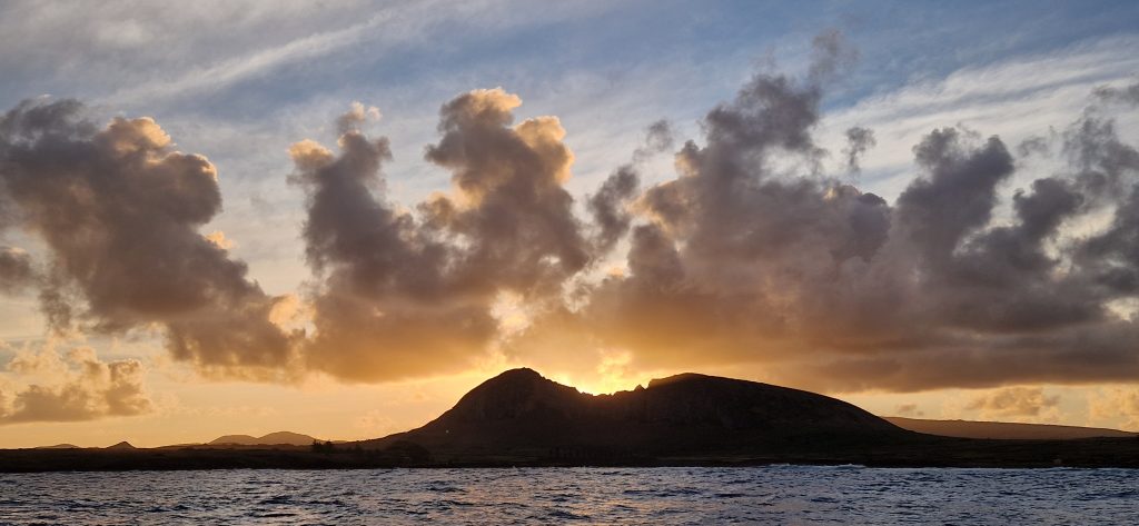 Nachdem Fred und der Außenborder schließlich verstaut sind und soweit alles vorbereitet ist, heißt es endlich gegen 19 Uhr Anker auf. Doch hier der erste Schreckmoment, unsere Ankerkette hat sich wohl irgendwo am Grund um einen Felsen verschlungen. Mit ordentlich Zug auf der Kette und dem leichten auf und ab in der Dünung vom Boot kommt sie schließlich frei, Glück gehabt. Hätte das nicht funktioniert, hätte sich die Abfahrt wohl um einen Tag verschoben. Bei 20 m Wassertiefe hätte es eine Tauchausrüstung benötigt, um die Kette wieder frei zu bekommen. Unsere ist gut um Schiff verstaut und sich an eine der örtlichen Tauchschulen zu wenden, hätte alles noch einiges an Zeit gekostet. Bis es soweit gewesen wäre, wäre es schon so dunkel, daß daran nicht mehr zu denken gewesen wäre ins Wasser zu gehen, Tauchlampen haben wir leider keine dabei. Es hätte auf den nächsten Tag verschoben werden müssen. Aber wie gesagt, Glück gehabt.