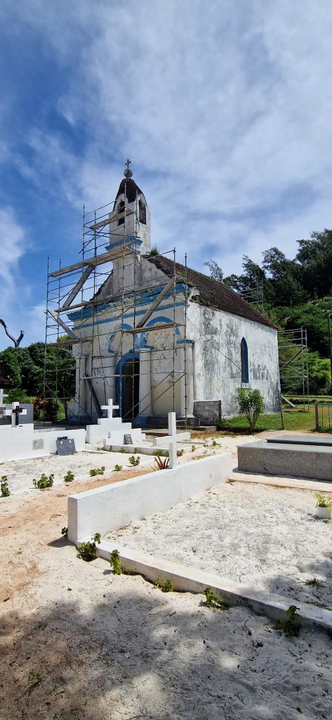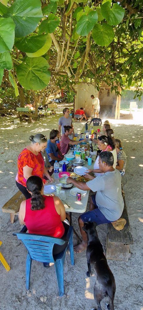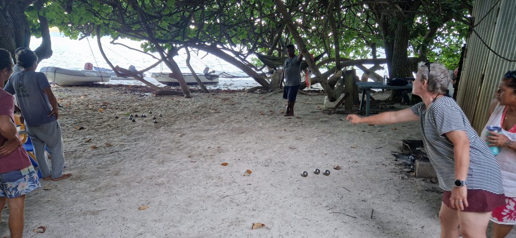 Wir wechseln jetzt hier also die Ankerplätze so durch und zwischendurch fahren wir immer wieder mal nach Rikitea zum ankern. Hier sind nun mal die Wanderwege, die Einkaufsmöglichkeiten und die Chance, am Wochenende auch mal zum Essen zu gehen. So haben wir hier endlich wieder einmal gute Pommes gefunden. Nach einem Jahr Chile mit „Latschepommes“ ein Genuss. Am Sonntag treffen sich die Einwohner zum Boule-Spielen hinter dem Rathaus, leider können wir uns kaum unterhalten, da wir ja so gar kein Französisch können und die Menschen hier halt nur etwas Englisch. So ist ein kleiner Plausch eher schwierig. Die Leute sind jedoch alle sehr freundlich und heißen uns immer Willkommen. Vor allem, da wir mal keine Franzosen sind 😊 Diese sind hier natürlich in der Überzahl. Momentan sind wir hier 8 Segelboote, davon eines von Schweizern, die hier leben, wir und der Rest Franzosen – und diese fahren meist Katamarane. Für diese Landsleute ist es natürlich auch einfach – sie dürfen hier auch arbeiten gehen ohne Probleme. So haben wir einen jungen Franzosen kennengelernt, der über die Karibik und den Panama-Kanal hierher gekommen ist. Er hatte zwischendurch in der Karibik einmal gearbeitet und plant dies dann wieder für Neu-Kaledonien. Das ist der Vorteil, wenn sein Land noch „Kolonien“ hat.