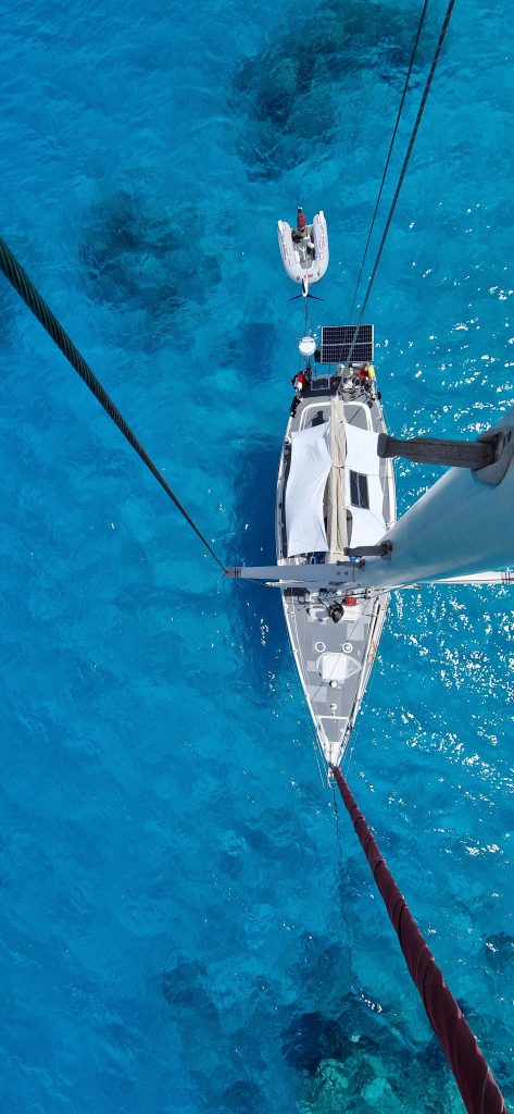 So ist beim ankern Voraussicht wichtig: man sucht sich einen hellen Fleck, der für Sandgrund steht und prüft, ob dieser groß genug ist, um darin zu schwojen. Sind in der Nähe doch einige Bommies, so werden nochmals Ankerbälle in die Kette eingehängt, so daß die Ankerkette nicht komplett auf dem Grund liegt sondern eher im Wasser schwebt. Und somit über den Bommies. Jochen prüft beim ersten Schnorcheln dann immer, ob das so passt und evtl. verlegen wir nochmals oder schleppen den Anker mithilfe einer Leine ein paar Meter weiter. Save the nature! Bis jetzt hat es geklappt.
