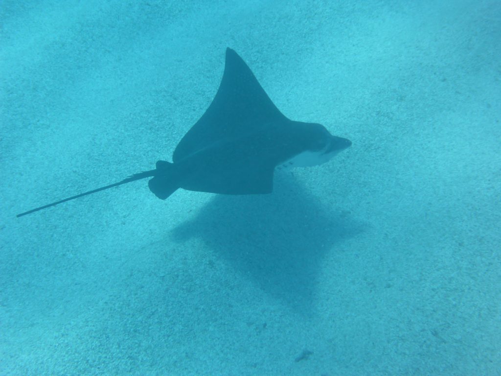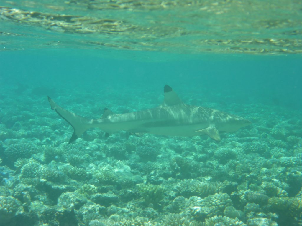 Wir haben natürlich auch schon andere Ankerplätze hier im Atoll besucht. Der erste Platz war am Motu Totegegie, der Flugplatzinsel. Dort ist ein Pass raus in den Pazifik, wo man toll schnorcheln kann. Man muß nur auf die Gezeiten achten, denn hier zieht es schon ordentlich rein und raus. Wir haben dann gleich bei der ersten Erkundung 12 kleine Schwarzspitzen-Riffhaie direkt am Strand gezählt. Jochen hat sich dann auch die Flossen angezogen und ist mal kurz ins Wasser; um festzustellen, daß selbst ihm die Strömung dann doch zu arg ist. Ich hatte gleich abgewunken. Wir sind dann auch die komplette Insel abmarschiert, nur leider wurde uns am Flughafen verwehrt, hier weiter zu gehen. Haben wir es wirklich geschafft, am Flughafen vorbeizukommen, wenn außerplanmäßig ein Flieger da war. Somit war auch Personal vor Ort und jenes teilte uns mit „nicht erlaubt“.
