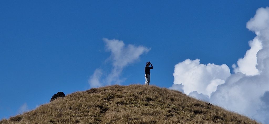 Am nächsten Tag machen wir uns morgens auf den Weg, wir wollen heute einmal auf den Vulkan im Osten hochlaufen. Zunächst geht es noch die Straße entlang und dann biegen wir ab auf einen Feldweg und querfeldein den Berg hoch. Eine atemberaubende Aussicht von dort oben über die Insel und die Buchten. Auch unsere Dicke ist noch auszumachen in der Entfernung. Rapa Nui ist ja eine sehr öde Insel mit nur wenigen Bäumen und eher niederer Vegetation. Auf dem Weg nach oben finden wir eine Baumgruppe und ich würde gerne eine kurze Rast im Schatten machen. Tja, leider belegt von einer Kuhherde, die uns argwöhnisch beäugen. Die leben hier ja eher wild und sind Menschen nicht gewohnt. Also halten wir uns nicht lange auf und der Weg geht weiter nach oben.