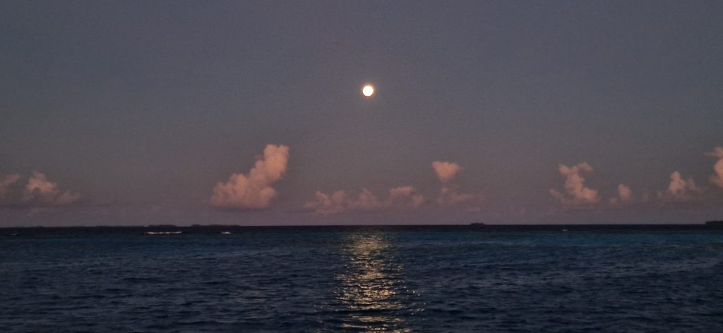 Wir wackeln uns durch den Tag und durch die Nacht. Manchmal nimmt der Wind etwas ab, dann Rollen wir wieder mehr durch die Wellen und die Genua fängt das Schlagen an. Schließlich fahren wir etwas mehr in den Wind, um das zu vermeiden und ändern es wieder, wenn der Wind wieder zulegt. Kurz vor Sonnenuntergang haben wir einen Biss an der Angel. Wir bereiten uns vor und Jochen fängt an, die Leine einzuholen. Da zieht etwas ordentlich oder liegt es an unserer Geschwindigkeit? Nichts desto Trotz, leider befreit sich der Fisch wieder und der frische Fisch für die Kombüse muss noch etwas warten. Sonst keinerlei Vorkommnisse oder Schiffssichtungen. Einmal kurz Starlink anwerfen, Geburtstagsgrüße nach Deutschland versenden, Wetter checken und das war es dann für heute. Die Nacht ist wieder klar, diesmal schon weitgehend ohne Lichteinfluss von der Küste und so ist der Sternenhimmel zu bestaunen, der Mond kommt erst wieder nach Mitternacht und fängt an das Wasser in eine Spiegelfläche zu verwandeln.