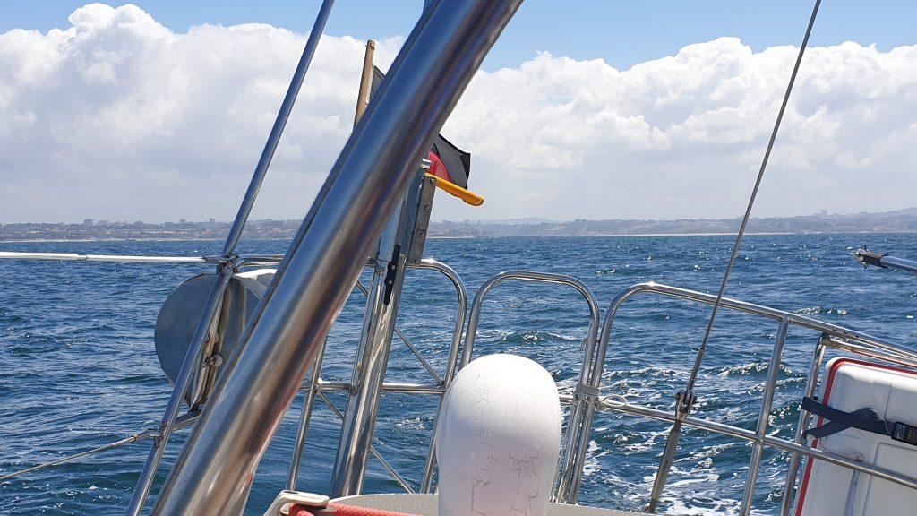 Der Atlantik erwartete uns wieder mit seiner langen Dünung, kaum aus der Hafeneinfahrt draußen wurden die Segel gesetzt, das Großsegel mal gleich vorsichtshalber in des Reff 2 (unser Großsegel hat 3 davon, mit denen man die Segelfläche den Windverhältnissen anpassen kann). So ging es dann mal Kurs West, wir hatten Nordwind. Plan ist erst einmal mit besagten Kurs weit raus zu segeln um dann, wenn der Wind dreht, mit diesem direkt auf die französische Nord-Westküste zu zusteuern.