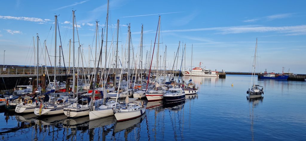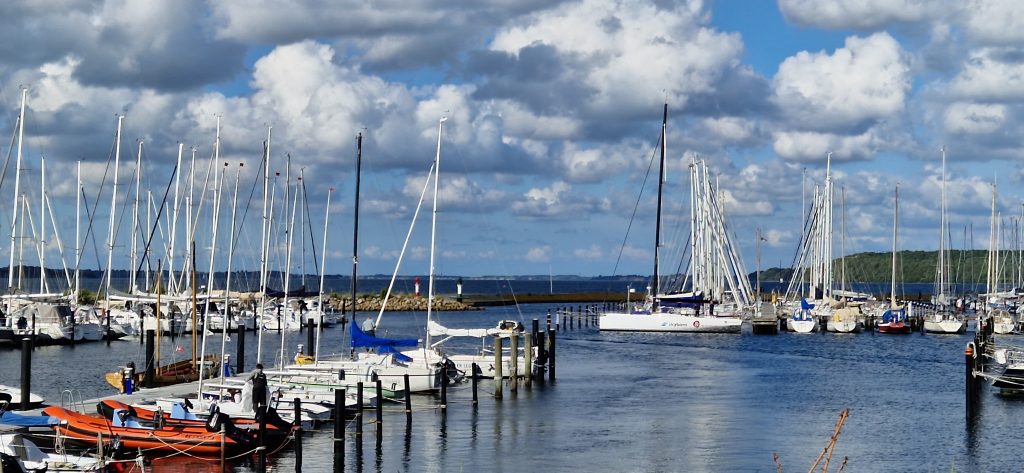 Im Hafen gibt es ein italienisches Restaurant, eine sehr gute Eisdiele, ein Cafe, ein kleiner Supermarkt, natürlich Segelsportzubehör und „unsere“ Segelschule Sailaway, über die wir überhaupt hier her gekommen sind. Und nicht zu vergessen: die allerbeste Fischbude „Goldfisch“. Hier muß man unbedingt den Sherryhering mit Honig-Senf-Sauce probieren. Das ist immer unsere erste Anlaufstelle, wenn wir hier angekommen. Und danach dann gleich die Eisdiele auf der Galerie. Fußläufig kann man noch nach Strande rüber oder die nähere Umgebung erkunden. Wir haben inzwischen auch einen schönen See entdeckt und ein gutes Burgerrestaurant.