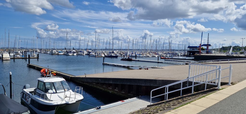 Ehrlich gesagt: kein schöner Hafen, 70er-Jahre Betonklotz-Stil, der damals zur Olympiade gebaut wurde, eher funktionell. Das Gute: man muß nicht lange aus Kiel herausfahren, sondern ist gleich in der Förde und kann lossegeln. Um’s Eck ist die Einfahrt zum NOK.