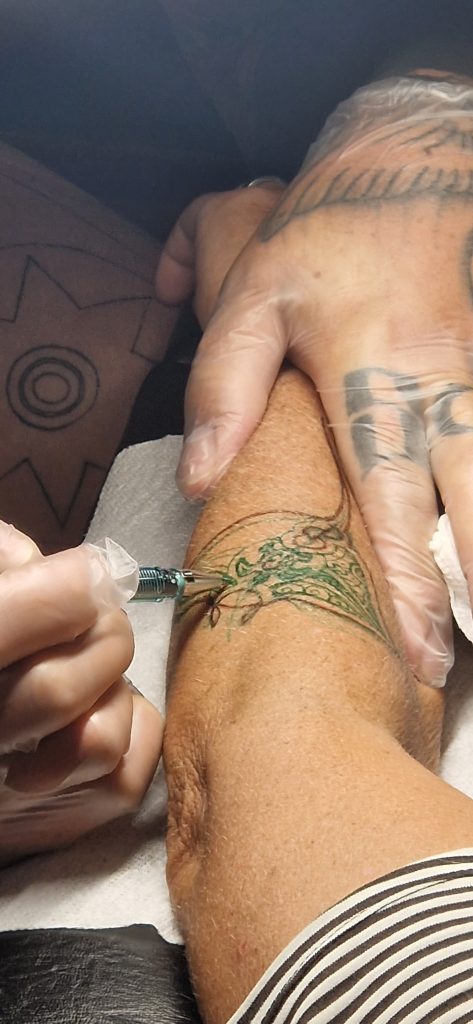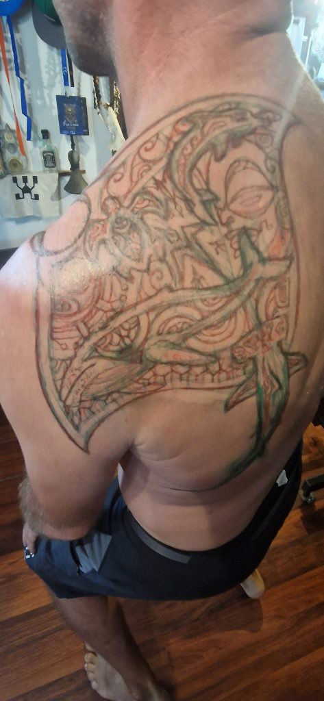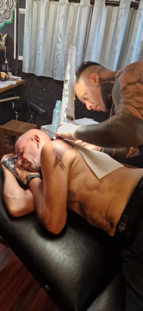 So kam es, daß wir bereits 3 Tage später bei Kaha unter der Nadel lagen. Nach einer kurzen Besprechnung, was wir uns jeweils vorstellen, ging es schon los mit dem direkten Aufzeichnen auf der Haut – von wegen einer Papierschablone. Hier wird noch schön gleich freihand auf der Haut gezeichnet. Nach schnellen 3,5 Stunden waren beide Tattoos gestochen und wir sind glücklich wieder abgezogen. Danke Kaha!