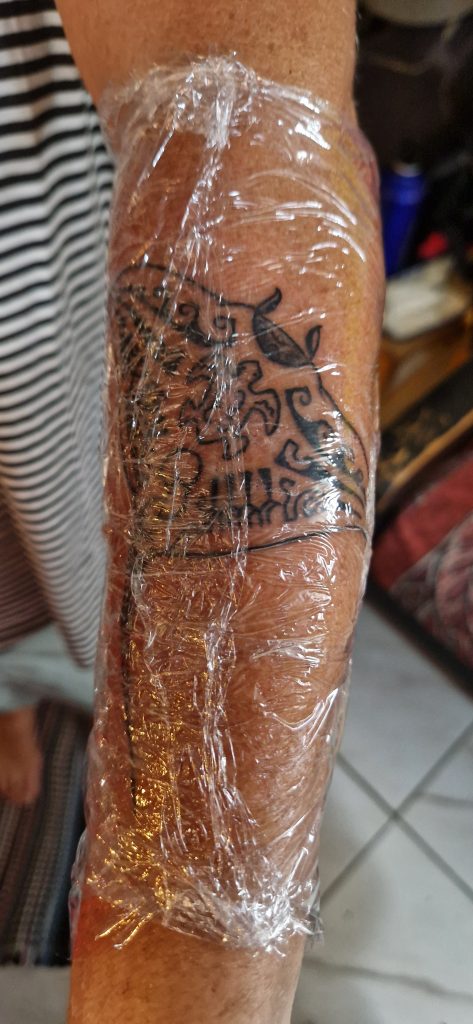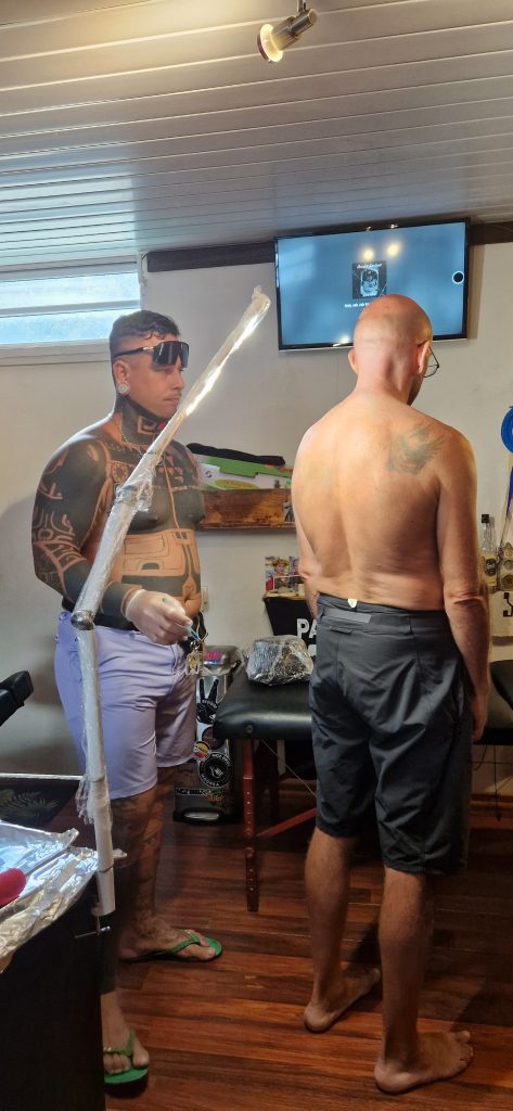 Und so war unser erster wichtiger Gang natürlich zum Tattoo-Studio, um einen zeitnahen Termin zu bekommen. Soll man doch nach dem Stechen etwa 3 Wochen Sonne und Salzwasser meiden – diese Zeit wollen wir in Hiva Oa verbringen, um bei evtl. auftretenden Problemen ebenfalls in der Nähe eine medizinische Versorgung in Anspruch nehmen zu können.