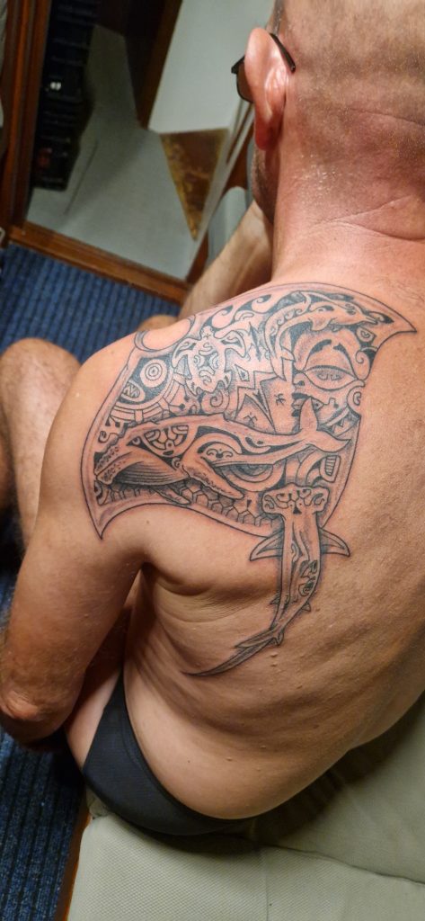 Zu diesen Tattoos möchte ich noch anmerken bzw. habe ich ja schon erwähnt, daß jedes Symbol auch eine Bedeutung hat. So steht z.B. die Schildkröte auf der einen Seite für die Familie, da sie ja viele Nachkommen zeugt aber ebenso auch für eine sichere Navigation – da sie immer wieder an den Strand ihrer Geburt zurückkommt, um dort selbst ihre Eier abzulegen. So haben wir auch uns bewußt unsere Symbole im Vorfeld ausgesucht, die wir haben möchten und Kaha hat dann „drumherumgebaut“ mit den dazu passenden Symbole wie Sonne, Wind, Wellen… So hat Jochen in seinem Manta sämtliche großen Meerestiere wie den Buckelwal, den Hammerhai, den Delfin, die Schildkröte aber auch den Albatros und den Gecko versteckt sowie einen Tiki. Als auch das Kreuz der Marquesas, es steht für das Gleichgewicht der vier Elemente: Feuer, Erde, Wasser, Luft. Wer findet und erkennt alle Symbole?