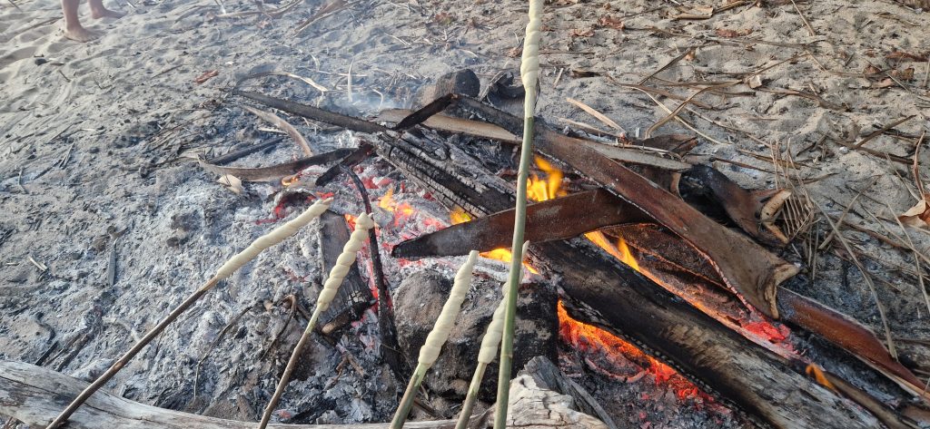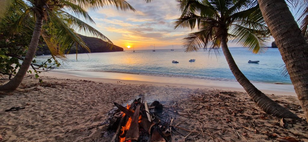 So war die erste Amtshandlung in der sauberen Bucht Hanamoenoa: Unterwasserschiff sauber machen. Das Ganze hat sich über zwei Tage gezogen, bis die ganzen Seepocken wieder ab waren. Leider sind bei dieser Aktion ein paar Quallen zu nah an die Wade von Jochen gekommen. Im Wasser noch nichts bemerkt, fühlte es sich an Deck wie ein Sonnenbrand an, nur die Röte dazu hat gefehlt. Am nächsten Morgen dann die Überraschung, alles mit kleinen Bläschen übersät. So könne und wollen wir nicht zu unserem nächsten Ziel starten. Erst einmal auskurieren. Schließlich verbringen wir hier auch noch einige schöne Tage, haben zusammen mit Gordi und Juliet und den Dänen von der Sommerwind, Silvia und Frank, ein Lagerfeuer am Strand mit Stockbrot, verbringen zwei Spielabende mit der Crew der Carosy und der Penny Lane und lernen hier dann den nächsten deutschen Neuankömmling kennen – Dirk von der Manus 2. So liegen wir hier kurzzeitig mit 3 deutschen Booten – Gott, wie lange hatten wir das denn nicht mehr – Unterhaltung nur in der Heimatsprache.