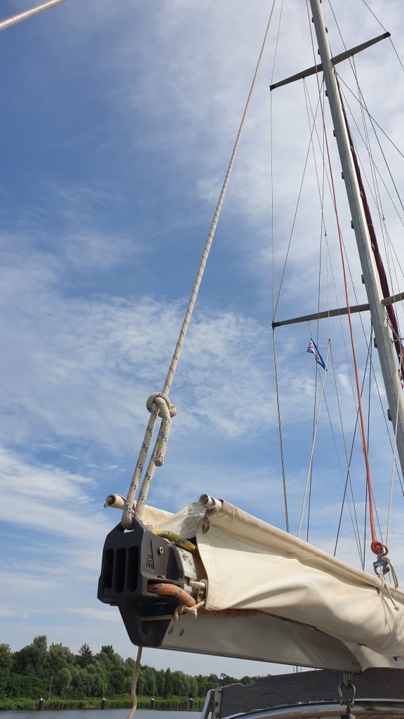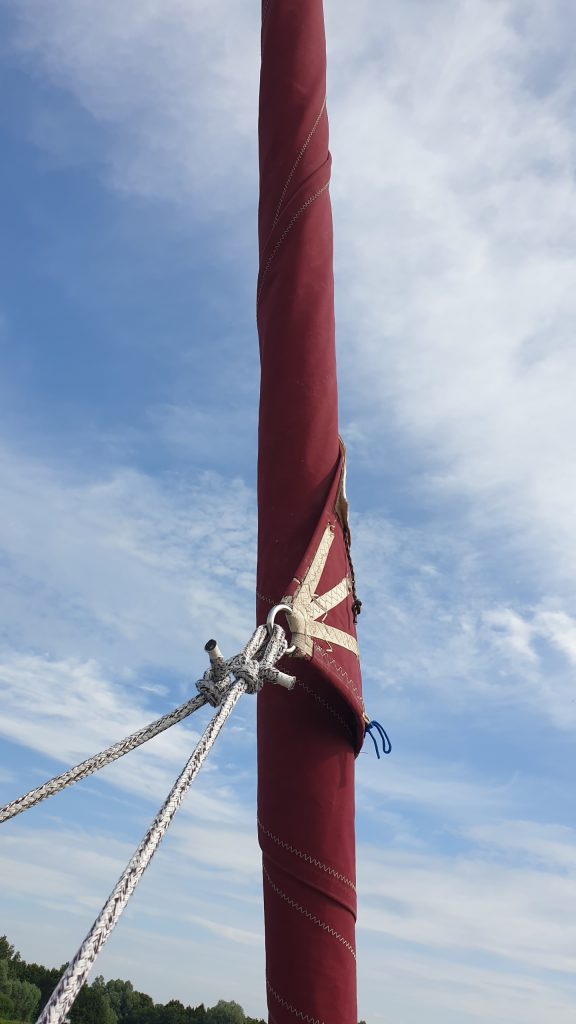 Der riesige Stecken, der senkrecht auf dem Boot steht und 16 Meter bei uns in die Höhe ragt, ist der Mast. Daran hängt waagerecht angebracht, der Baum. Hier ist das Großsegel „angeschlagen“, also angebracht.