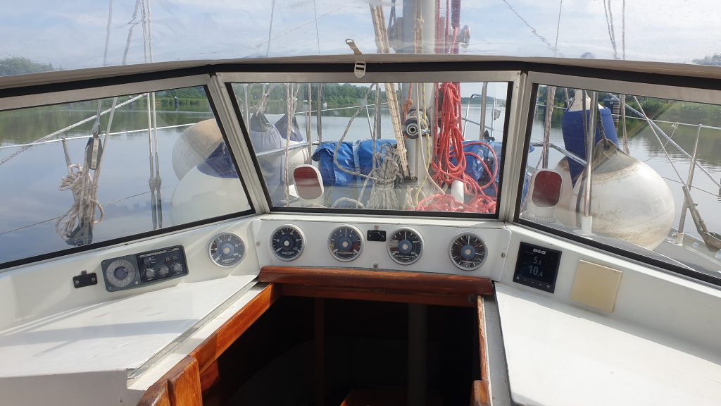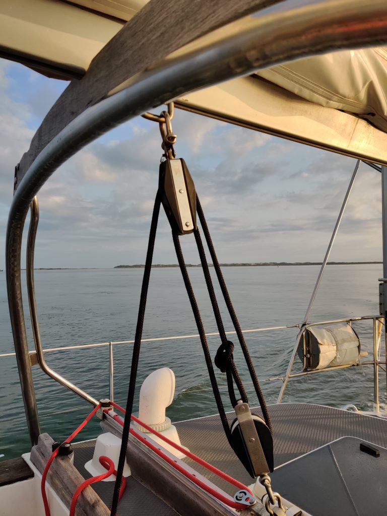 Aufgemerkt: Gerda haben wir unseren Autopiloten benannt, es gibt aber auch einen Dirk. Nein, kein von uns vergebener Name und auch kein „Er“, sondern „die Dirk“. Die hat die Aufgabe am Schiff, wenn das Großsegel nicht gesetzt ist, den Baum oben zu halten um ihn daran zu hindern einfach nach unten zu fallen. Zu sehen ist die Leine, am hinteren Ende des Baumes und geht hoch zum Mast.