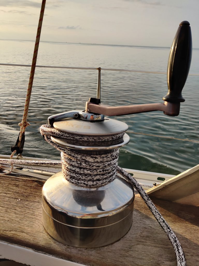 Alles, was wir hier an Leinen bedienen müssen, bedienen wir vormerklich über die Winschen. Das sind diese großen, silbernen „pollerähnlichen“ Dinger, die am Cockpit und am Mast angebracht sind. Da auf die Segel ein sehr großer Druck bei Wind ausgeübt wird, können wir diese nicht von Hand bewegen. Daher werden die Schoten um die Winschen gelegt und mittels einer Kurbel, die Wischkurbel, können wir dann kräftesparend (oder auch nicht) die Segel „dicht holen“. Dicht holen bedeutet, das Segel näher an die Schiffsmitte heranzubringen, was je nach Windeinfall halt von Nöten ist. Fieren dahingegen meint, daß wir das Segel etwas herauslassen, also weg vom Boot. Die Schoten bleiben übrigens immer auf den Winschen liegen und eingeklemmt. Wenn die Genua auf der Steuerbordseite ausgebracht ist, dann wird die Winsch auf der Steuerborseite genutzt und „belegt“, wie wir sagen. Hier ist dann wirklich ordentlich Zug drauf; also Finger weg davon und beim Bedienen aufgepasst, daß da kein Finger reinkommt. Sonst hat man keine 5 Finger mehr, sondern halt a bisserl weniger.