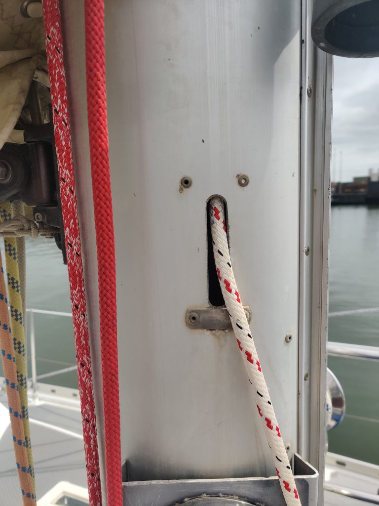Die Segel werden grundsätzlich nach oben gezogen an den dafür vorgesehenen Leinen, die in diesem Falle dann „Fall“ heißen. Großfall für das Großsegel und Genuafall für das Vorsegel. Die Fallen werden im Mast nach oben geführt, über eine Umlenkrolle geführt und am Ende ist ein Schäkel, der am Segel angebracht wird. Somit können wir das Segel dann hochziehen (=setzen).