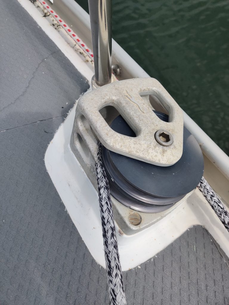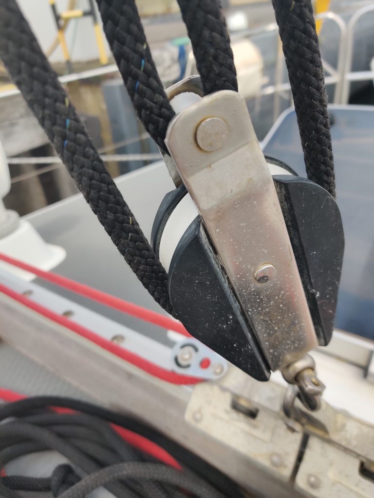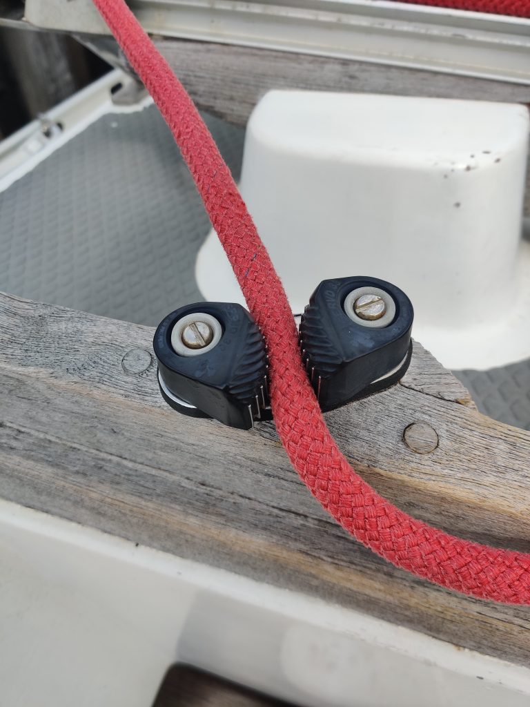 Klemmen klemmen eben Fallen und Schoten, um zu verhindern, daß diese zurück können. Blöcke sind Rollen, die diverse Fallen und Schotten umlenken. Klampen sind massive Beschläge, an den die Festmacherleinen eben fest gemacht werden. Festmacherleinen, die Verbindung vom Boot zum Land/ Steg.