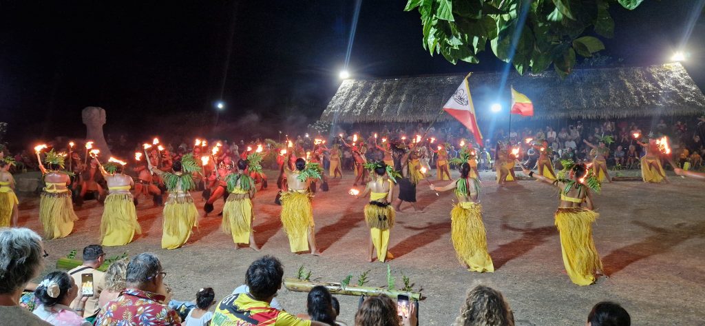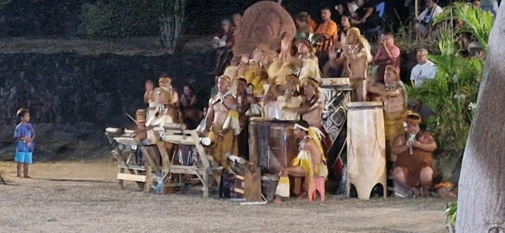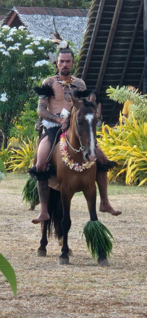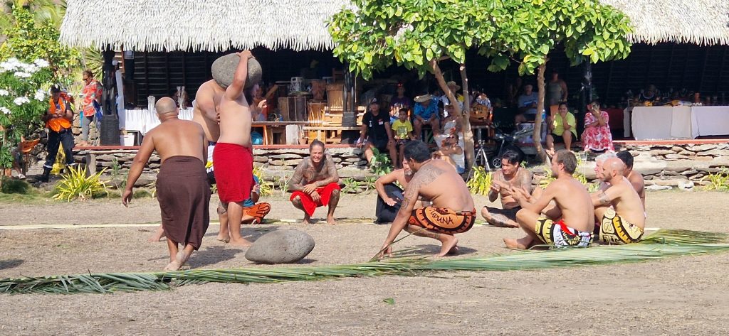 Ich möchte jetzt einmal Eure Vorstellung von Polynesien etwas ernüchtern: wir sind hier nicht am Ende der Welt, Polynesien gehört zu Frankreich und entsprechend gut ist es auch von französischen Touristen besucht, die hier auch arbeiten dürfen. Man trifft extrem viele junge Franzosen. Geht weg von dem Bild, daß wir uns hier auf einer einsamen Insel mit einem Häuptling befinden, die noch im Lendenschurz rumlaufen, so wie es die Fernsehbilder oder jetzt unsere Fotos vielleicht zeigen. Hier läuft auch jeder mit einem Smartphone in der Hand rum – nur man lässt es halt viel gemächlicher angehen – no stress. Dieses Festival soll eben an jene Zeiten erinnern und die Traditionen werden hin und wieder gepflegt.