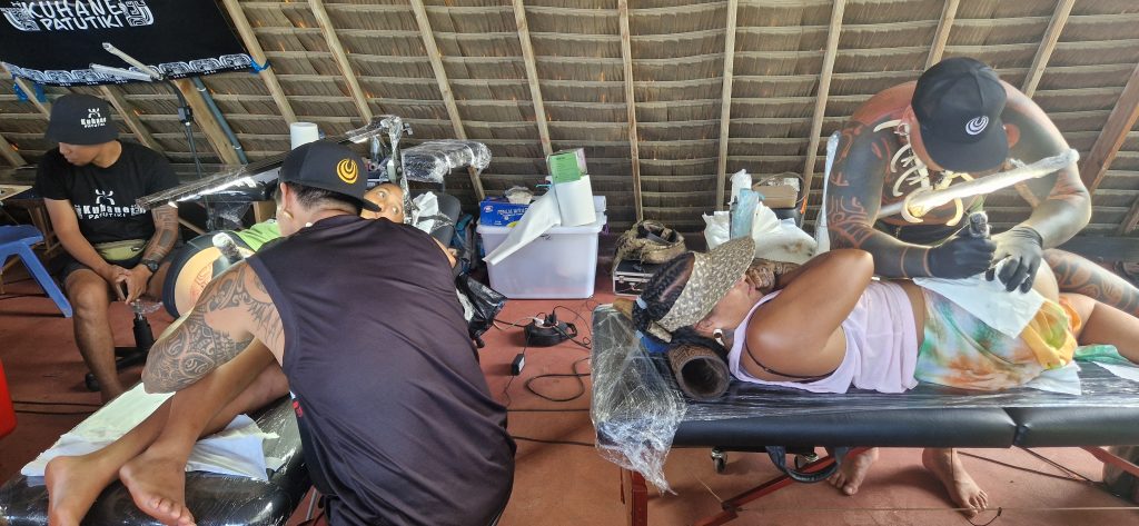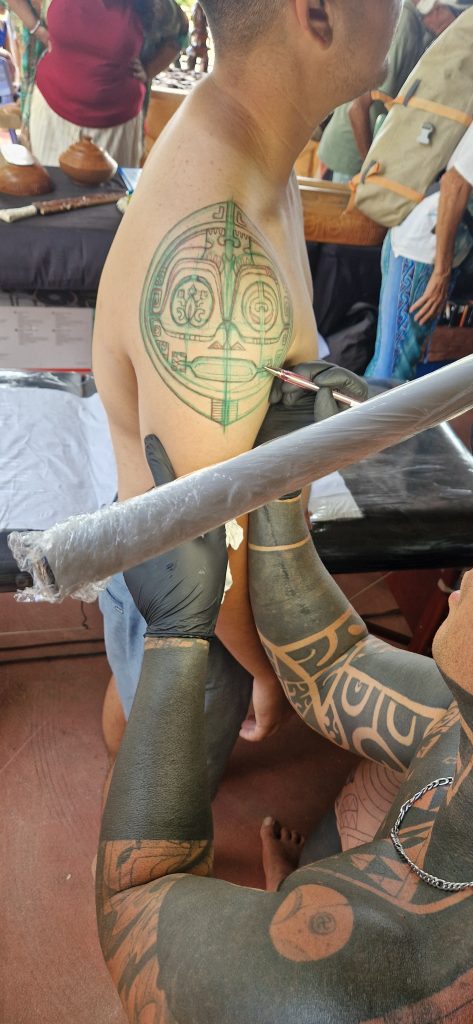 Nein, die Tätowierer hier benutzen nicht mehr die traditionellen Werkzeuge wie Hammer und „Kamm“, sondern arbeiten genauso elektrisch und professionell wie die Tätowierer bei uns zu Hause. Nur mit dem Unterschied, daß hier halt die Motive ganz anders sind und wenn man ganz korrekte Körperkunst tragen will: für jeden Körperteil gibt es ein bestimmtes Motiv, je nach Insel oder Archipel. So hat auch jedes Zeichen seine Bedeutung und manche sind wirklich nur den Einheimischen vorbehalten und man würde die als Tourist wohl nicht bekommen. Und es sind großflächige schwarze Flächen vorhanden, auch im Gesicht. Mehrfach wurde wir, als wir sagten, daß wir aus Deutschland sind, gefragt, ob wir einen Jo Steiner kennen würden. Dieser Deutsche hat wohl vor langer Zeit als Erster die polynesischen Zeichen und Malereien “übersetzt“ und in einem Buch zusammengetragen. Dieses Buch bzw. seine Erkenntnisse werden hier von allen Tätowierern und anderen Künstlern als Nachschlagewerk benutzt. Leider habe ich hierzu bei Onkel Google nichts gefunden. Wir haben jedoch auf Fatu Hiva so ein Originalbuch ansehen dürfen, das schon sehr zerfleddert war.  Falls hier irgendjemand etwas dazu finden sollte, bitte gebt mir diese Info weiter.